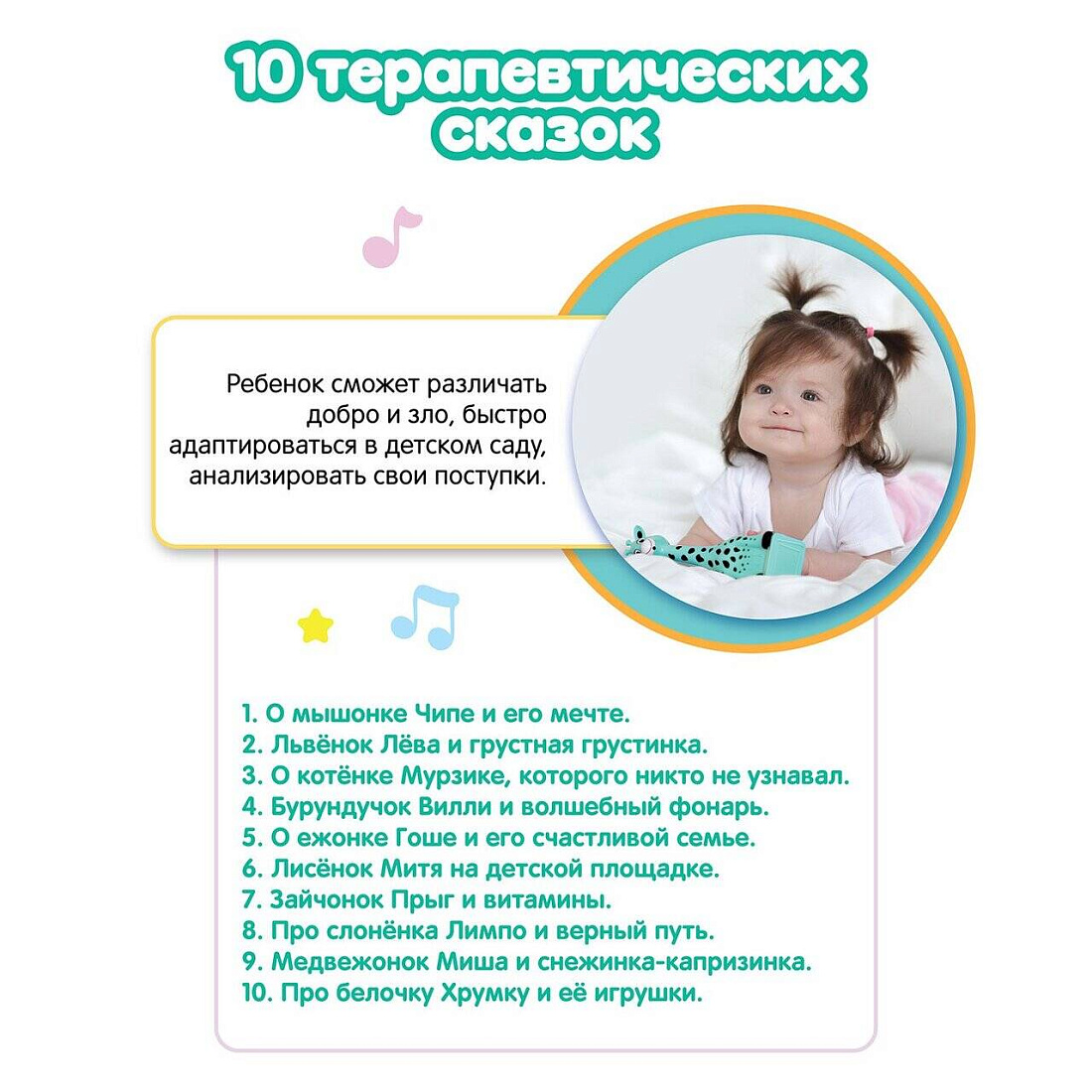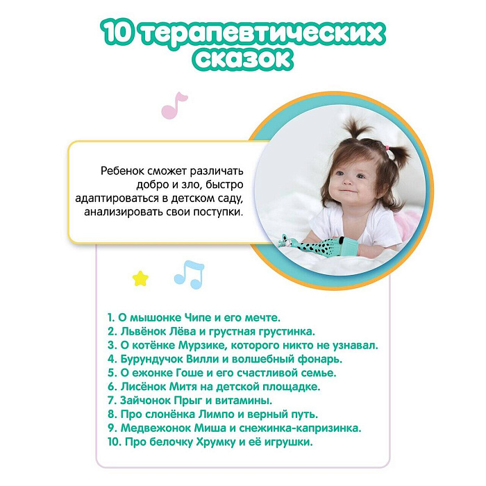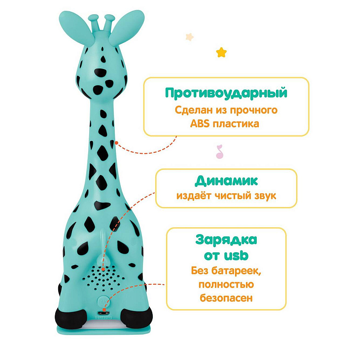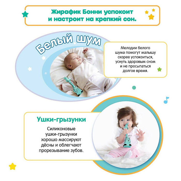 Режутся зубки? Мягкие силиконовые ушки-грызунки облегчат прорезывание зубов у малыша. Успокоить и уложить спать ребенка теперь легко: включите белый шум, который длится беспрерывно, более двух часов. А благодаря ночнику, который переливается разными цветами, оставаться одному в кроватке спокойно и уютно.