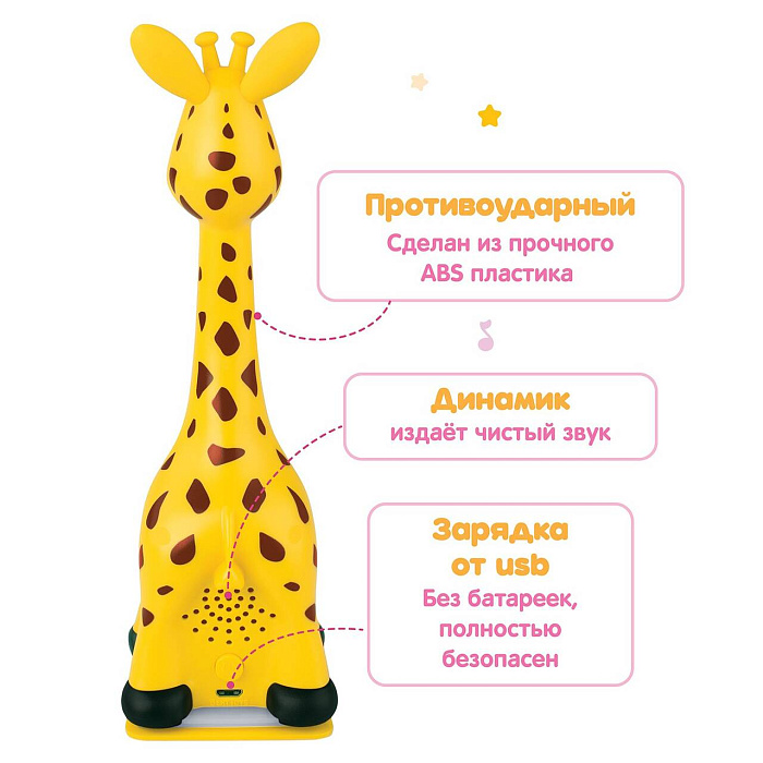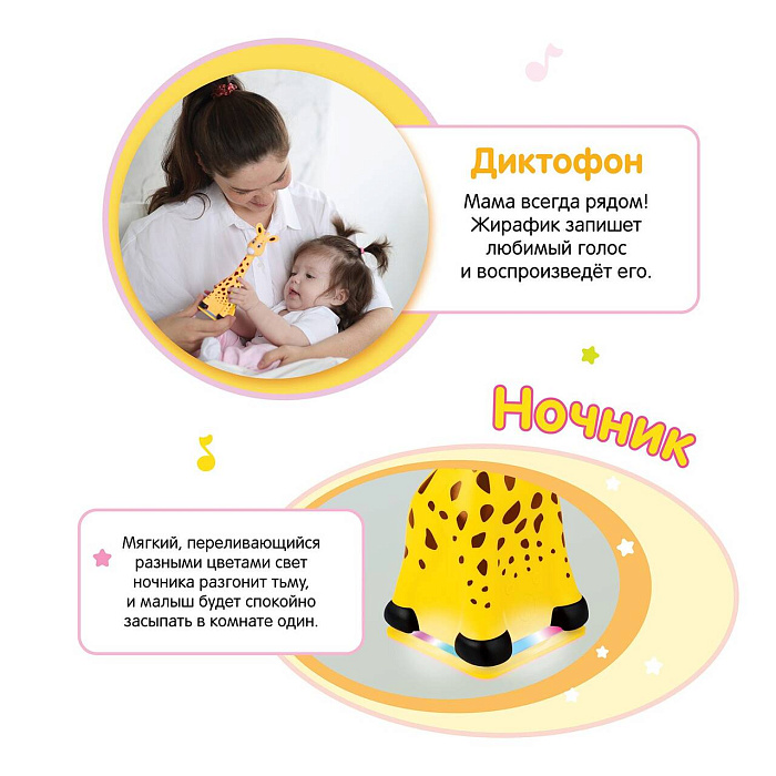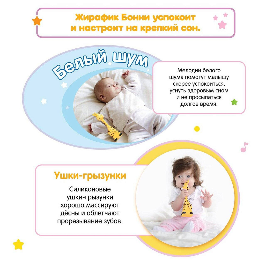 Режутся зубки? Мягкие силиконовые ушки-грызунки облегчат прорезывание зубов у малыша. Успокоить и уложить спать ребенка теперь легко: включите белый шум, который длится беспрерывно, более двух часов. А благодаря ночнику, который переливается разными цветами, оставаться одному в кроватке спокойно и уютно.