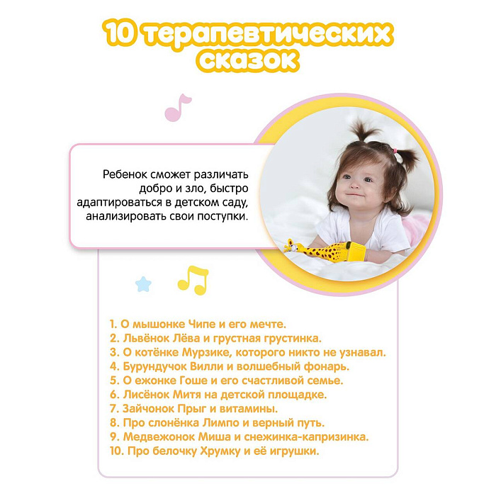 Вместе с Бонни легко развиваем речь, мышление, фантазию и воображение. Жирафик расскажет увлекающие терапевтические сказки, поиграет в словесные игры, задаст интересные загадки, обучит этикету, научит различать музыкальные инструменты.
