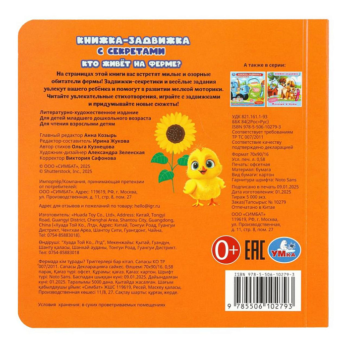 Малыш с удовольствием будет листать яркие странички и знакомиться с милыми обитателями фермы, на каждом развороте его также будут ждать занимательные задания. Ребёнку будет интересно выполнит все задания, ответы на которые можно узнать, если потянуть секретную задвижку. Благодаря компактному размеру книгу удобно брать с собой на прогулку или в дорогу.