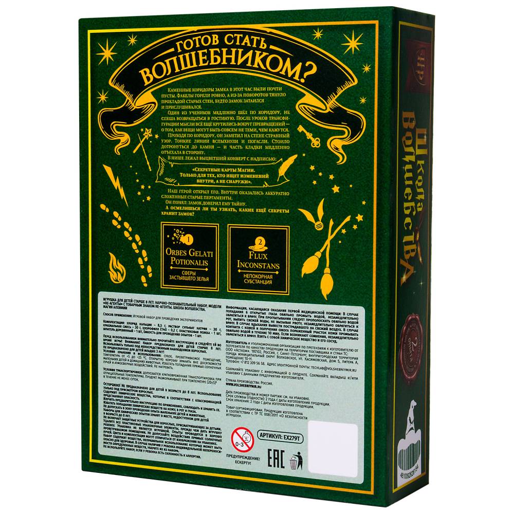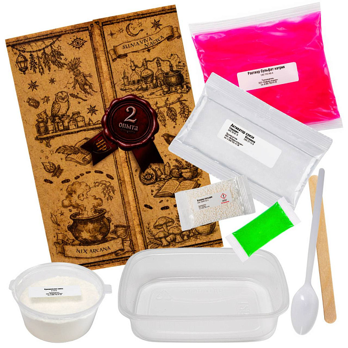 Познавательный набор в стиле таинственной школы магии, включающий два захватывающих опыта — «Сферы застывшего зелья» и «Непокорная субстанция», демонстрирующие необычные свойства веществ и их неожиданное поведение. Инструкция в виде свитка с картой мародёров и наглядными подсказками превращает проведение опытов в настоящее алхимическое приключение.