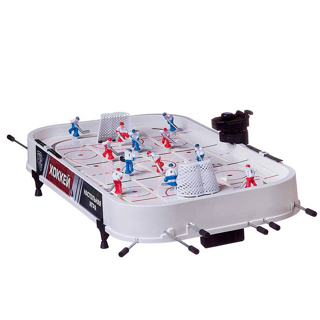 Игра выполнена в современном дизайне. Игровое поле с нанесенной разметкой, возможность игры нападающих за воротами придадут игре динамичность и реалистичность. Защитные бортики с обеих сторон ворот предотвратят вылет шайбы за пределы игровой зоны. Каждую забитую шайбу игроки будут отмечать на индивидуальных счетчиках, установленных на боковых бортах. Взброс шайбы в игру легко и удобно производить, используя специальное устройство, которое нужно разместить на борту игрового поля. Ручки управления имеют резиновые наконечники, которые будут способствовать легкому, уверенному управлению игроками. Надежные устойчивые ножки позволят приподнять игру над ст