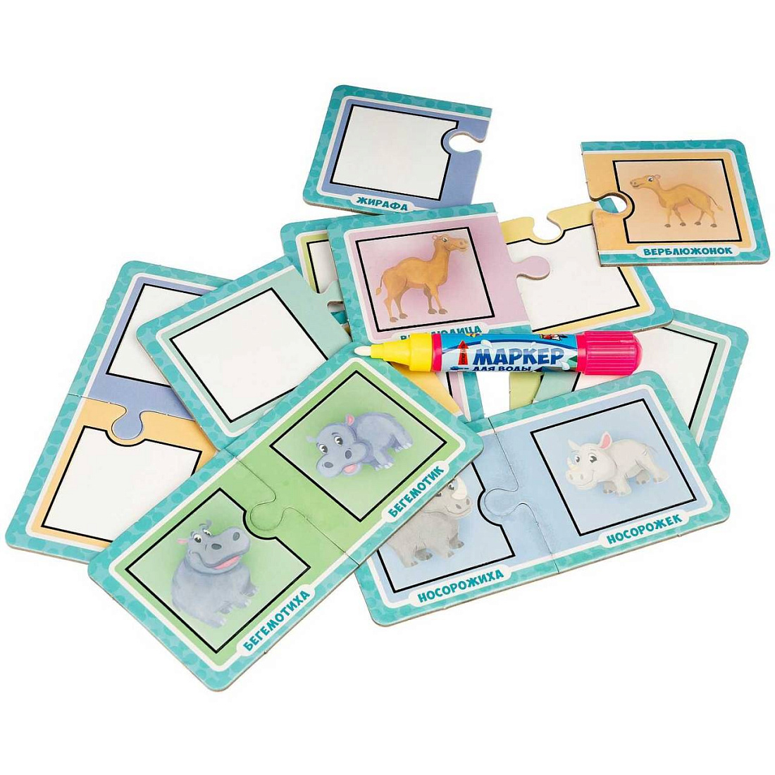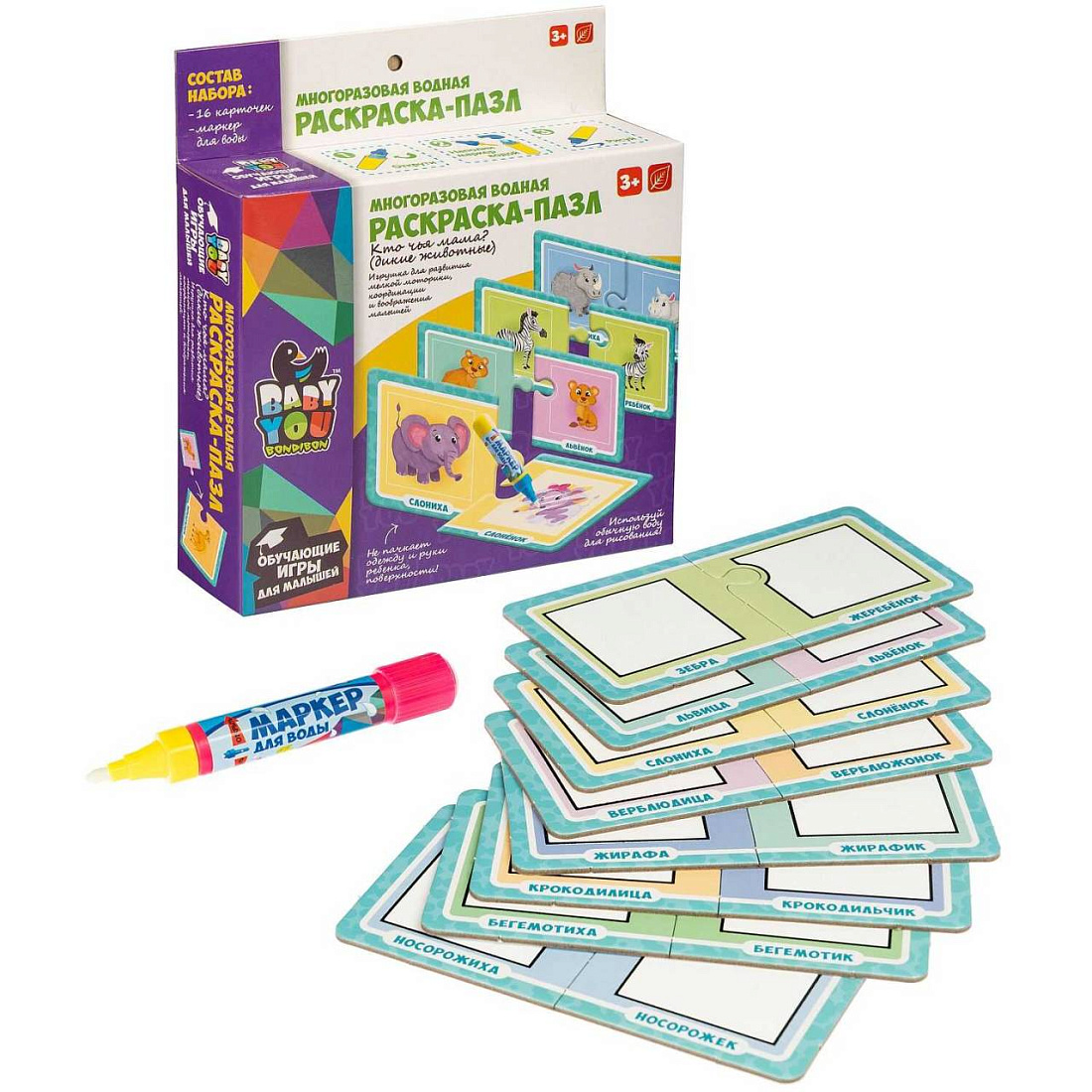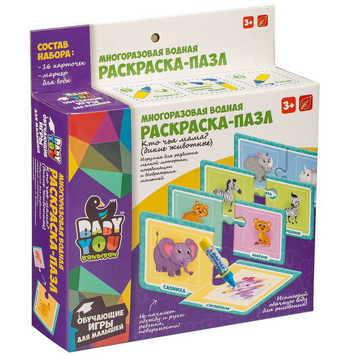 Набор пазлы-водные раскраски Bondibon, КТО ЧЬЯ МАМА? домашние животные, многоразовые,16 карт.,1 ручка