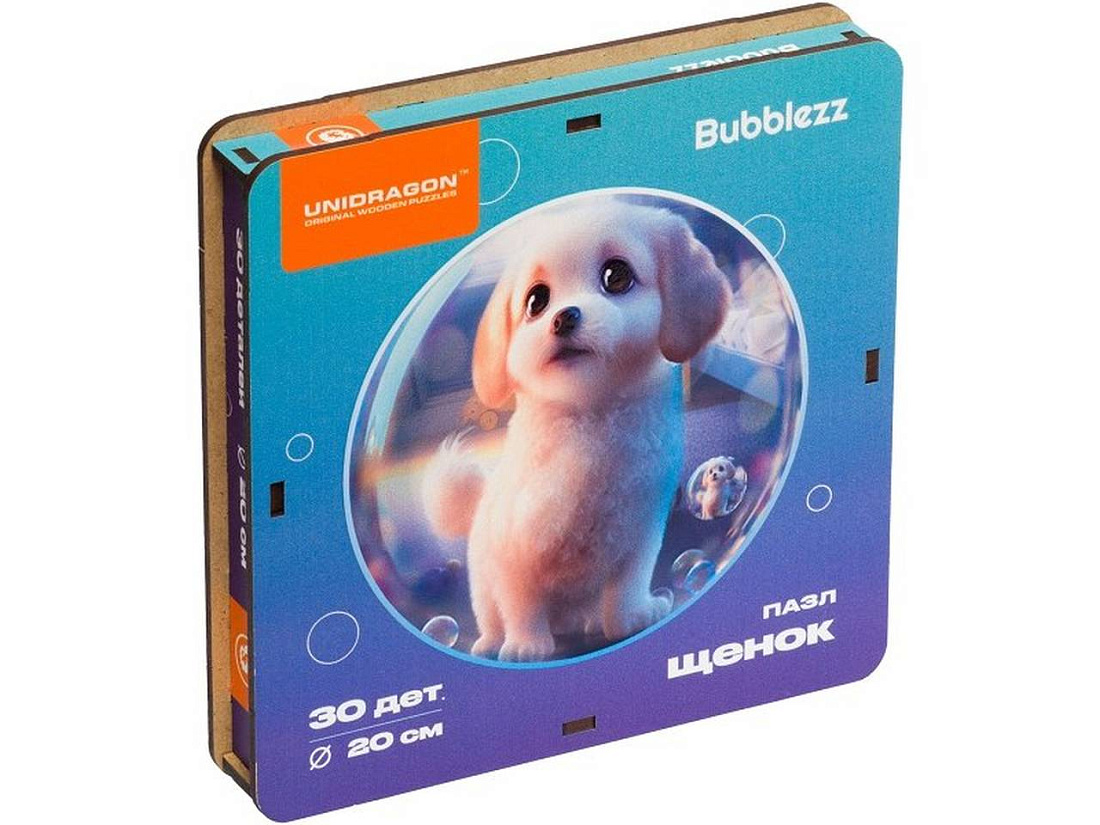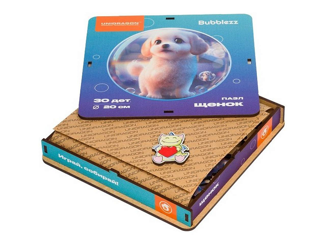 Этот щенок станет самым преданным игрушечным другом вашего малыша! Он излучает любовь и словно зовет играть. Развивайте мелкую моторику малыша, логику и внимательность, собирая эти яркие пазлы, и отыскивая детали в форме зверят и дракончиков. Коллекция Bubblezz создана специально для детей 3-5 лет. Выберите своего любимца из целой компании милых зверят, — они приедут в красивой коробке, которую тут же захочется открыть.Крупные и прочные детали удобно лежат в детской руке, тщательно обработаны и идеально подходят друг к другу. Специальное лаковое покрытие дарит им волшебное сияние и защищает от загрязнений. Пазл сделан из безопасных, экологичных материалов. В комплекте — коллекционная фигурка-дракончик! Все дракончики разные, сочините им историю вместе с ребенком, развивая его воображение. Это идеальный подарок, который в собранном виде украсит детскую.