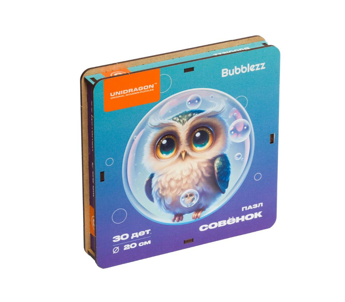 Из прозрачного мыльного пузыря на вас глядит … Кто это? Большие глаза, милая мордашка, забавные лапки. Это Совенок- один из симпатичных зверей серии Bubblezz от Unidragon, которая была создана специально для самых маленьких любителей пазлов.Развивайте мелкую моторику малыша, логику и внимательность, собирая эти яркие пазлы, и отыскивая детали в форме зверят и дракончиков. Коллекция Bubblezz создана специально для детей 3-5 лет. Выберите своего любимца из целой компании милых зверят, — они приедут в красивой коробке, которую тут же захочется открыть.