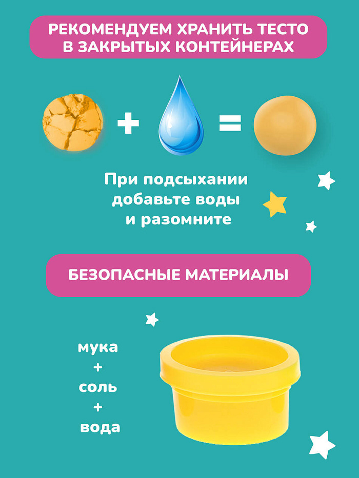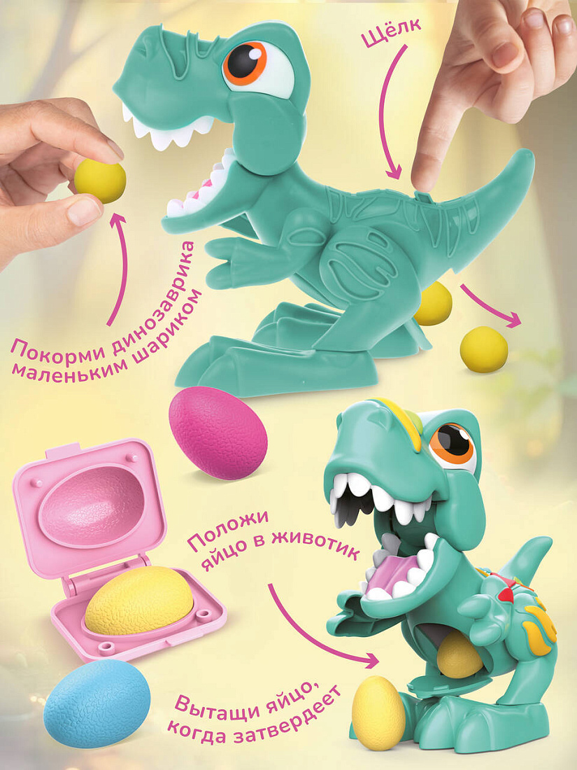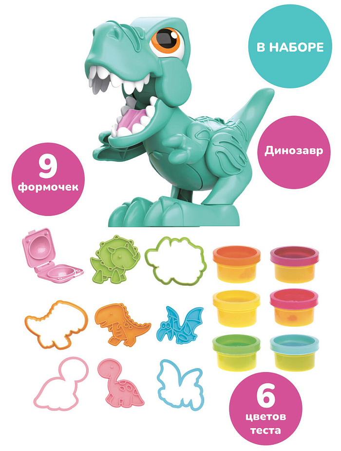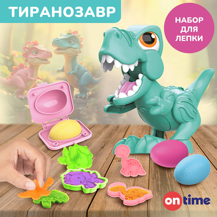 Набор для лепки «Динозавр» ТМ "ON TIME" станет замечательным помощником в развитии воображения и творческих способностей. В комплекте – тесто для лепки 6-ти цветов, пластиковый динозавр и 9 формочек. При помощи этого набора для творчества можно слепить из теста 4 вида динозавров и украсить тестом разного цвета фигурку забавного тираннозавра. Как играть? 1. Украсьте корпус динозавра с помощью теста. На голове, туловище и лапах динозавра есть контурные углубления, которые можно заполнять тестом разного цвета. 2. Слепите несколько разноцветных яиц, положив нужное количество теста в закрывающуюся формочку. Слепленное яйцо можно спрятать внутрь корпуса динозавра через открывающийся отсек на животе. 3. Слепите 4 объемные фигурки динозавров разных видов. Сначала сделайте силуэт динозавра, положив немного теста в одну из вырубных формочек. Затем возьмите подходящую формочку с внутренним рисунком и надавите ей на тесто так, чтобы на нем отпечатался контур. Материалы изготовления: пластмасса, тесто. Тесто безопасно