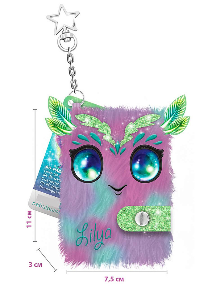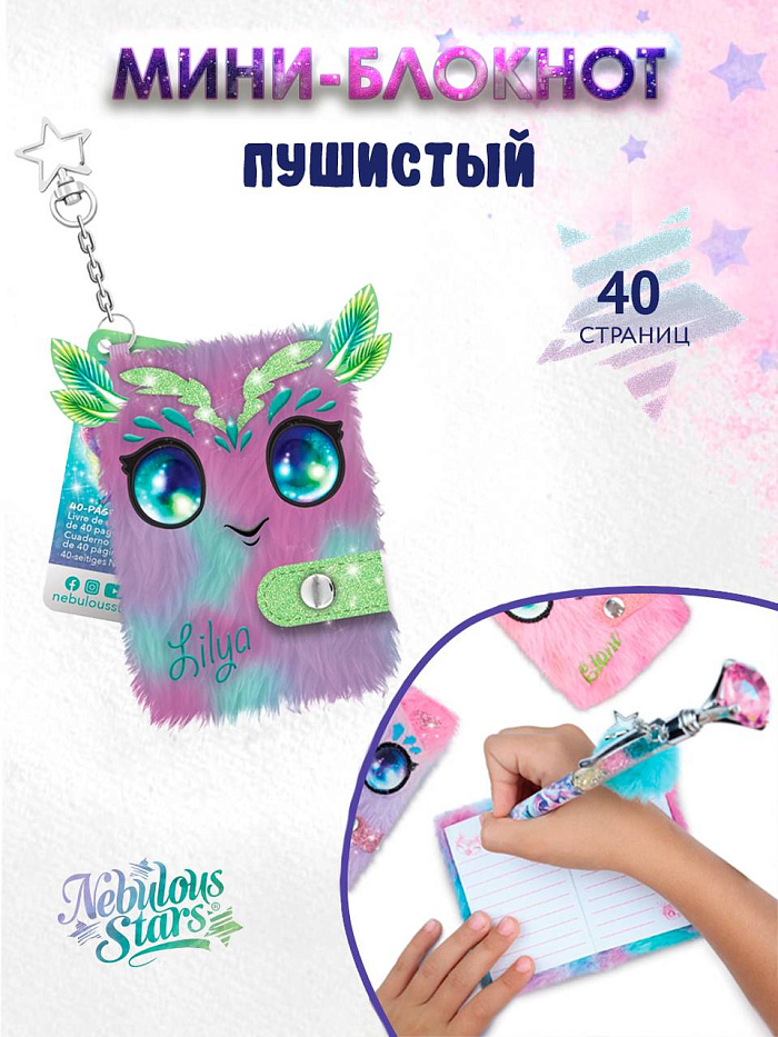Пушистый мини-блокнот для записей в виде одного из любимых персонажей Галактики Nebulous Stars – сказочного питомца, закрывается на кнопку. Яркий дизайн и разлинованные страницы с принтами внутри станут отличным напоминанием о героях Галактики Nebulous и отличный повод записать что-то интересное. Мини-блокнот оборудован красивым брелоком на цепочке, можно пристегнуть к портфелю, а можно спрятать в карман или маленькую сумочку, размер позволяет.