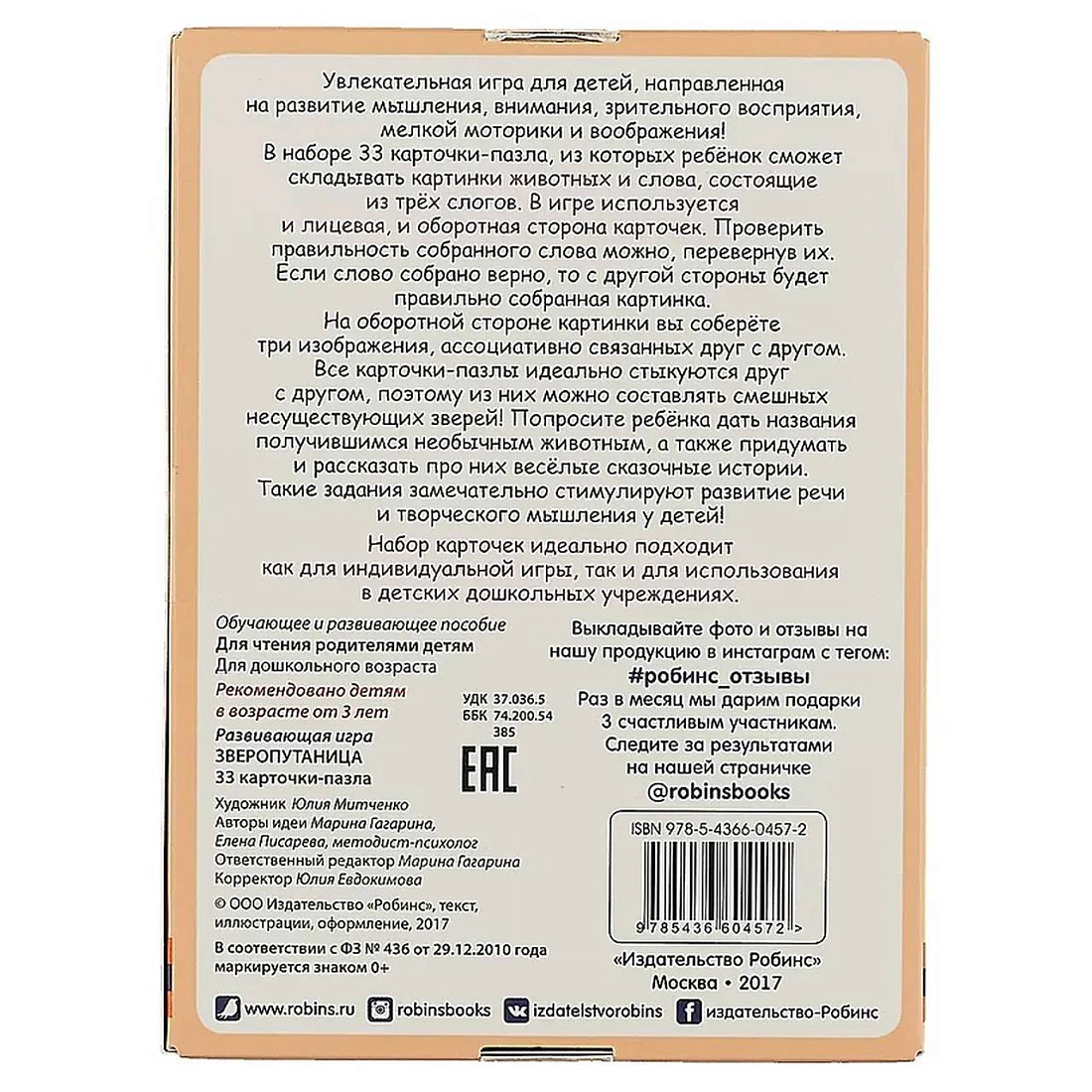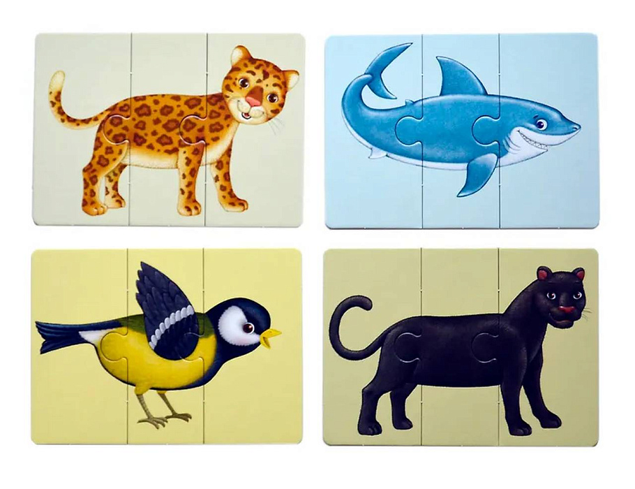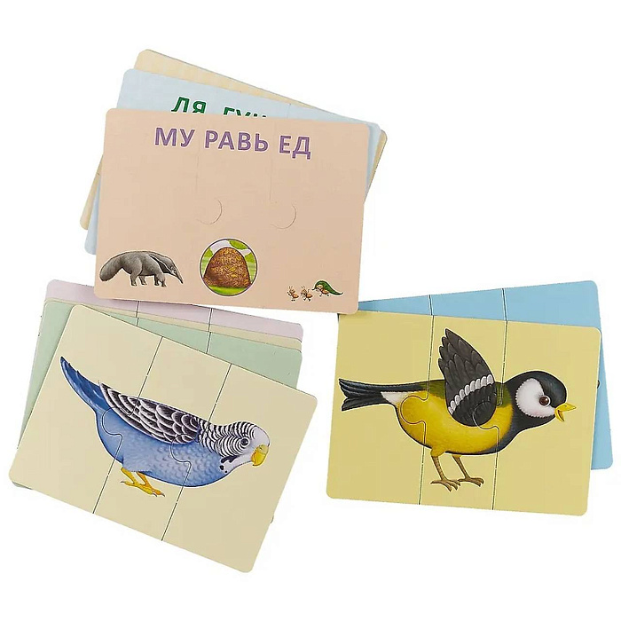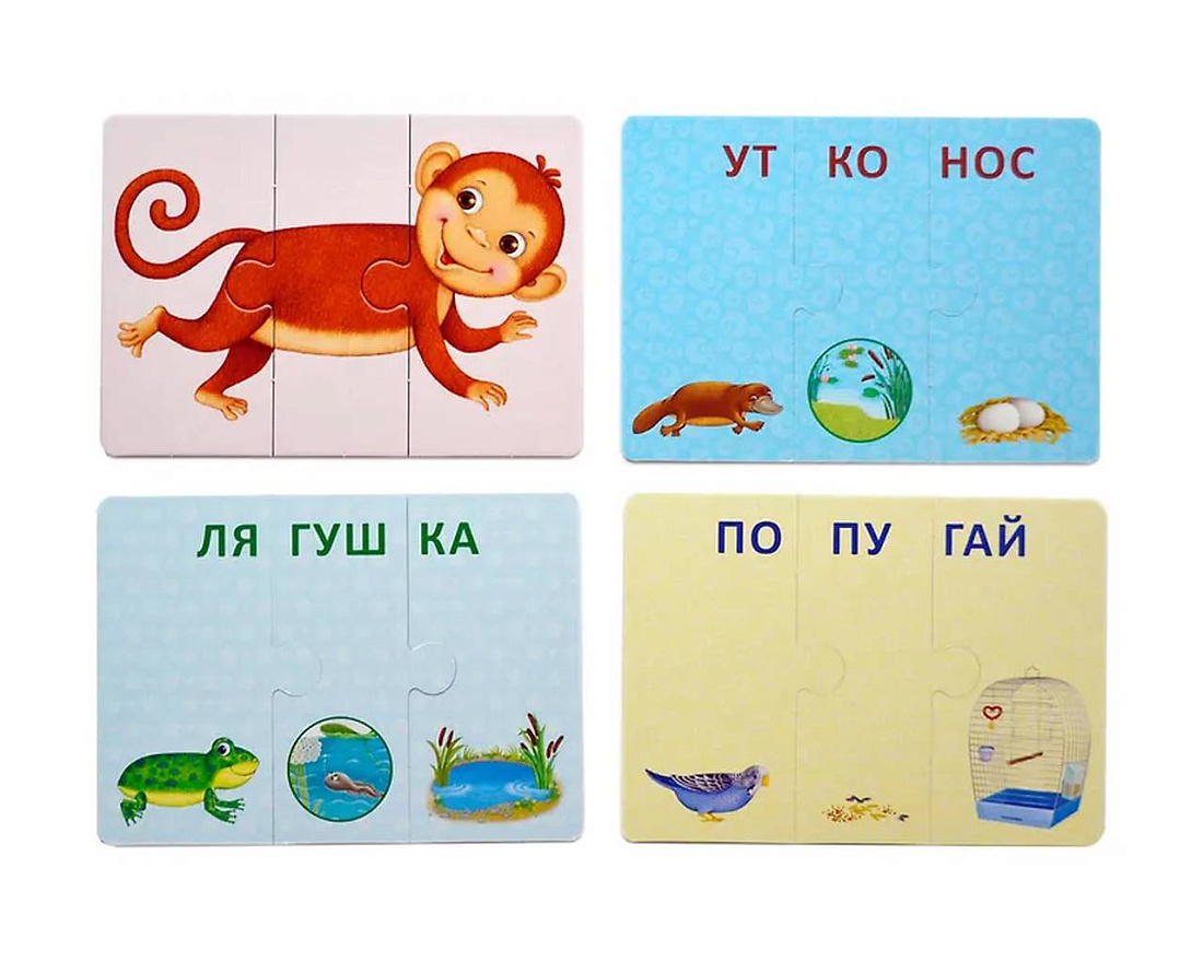 Из 33 двусторонних карточек-пазлов ребенок может складывать картинки с изображением животных и их названия, состоящие из трёх слогов. Если картинка собрана правильно, на обратной стороне получится правильное название животного и три картинки, ассоциативно с ним связанные. Если неверно – несуществующее животное и его смешное название.