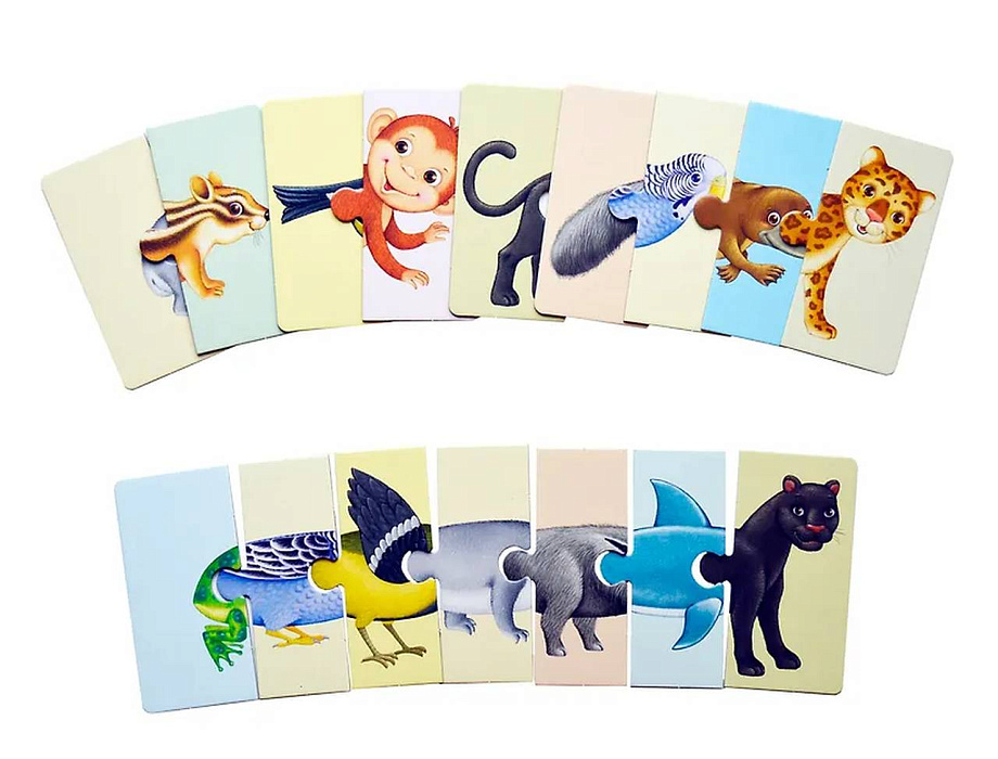 Все карточки-пазлы идеально стыкуются друг с другом, поэтому из них можно составлять длинные «колбаски» забавных несуществующих зверей!