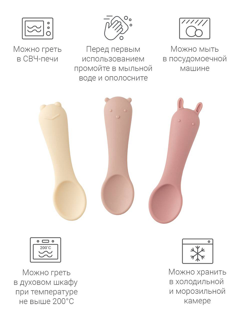 Ложечки мягкие и гибкие, ребёнок может сколько угодно грызть ложечки, не травмируя нёбо и дёсны. Размер и форма ложки разработаны с учетом физиологии малышей для лучшего захвата, поэтому она удобно ложится в ладошку малыша. Оригинальный дизайн в форме забавных зверей привносит элемент игры в ежедневное кормление.