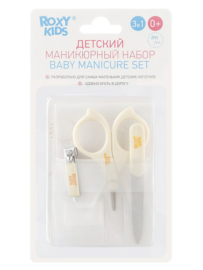 Маникюрный набор – предмет личной гигиены, поэтому будет разумно завести для ребенка свой, отдельный. Детские ножницы, пилочка и кусачки от Roxy-Kids созданы специально для того, чтобы ухаживать за ручками и ножками малышей с первых дней жизни. Они совсем маленькие, но тщательно продуманы для того, чтобы стрижка ногтей была максимально удобной и безопасной. К примеру, у ножниц закруглены концы, чтобы в случае, если ребенок сделает резкое движение, они не поранили его. А лезвия из металла очень тонкие, чтобы процесс был оптимально мягким. Маникюрный набор Roxy-Kids занимает совсем мало места, поэтому его удобно брать с собой в поездки. Качество товара тоже не разочарует: комплект прослужит долго и, возможно, пригодится не одному ребенку. Ножницы, пилочка и кусачки подойдут для ухода как за совсем крохотными малышами, так и за детками постарше.