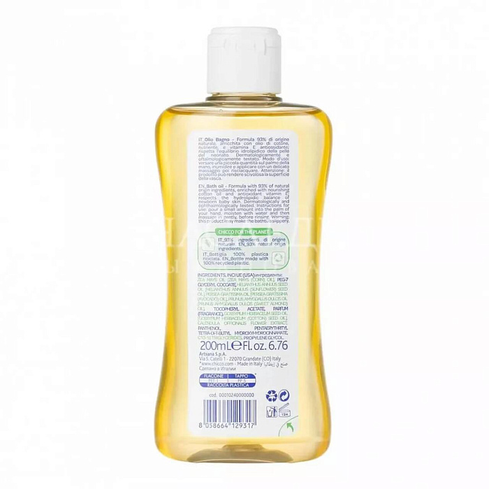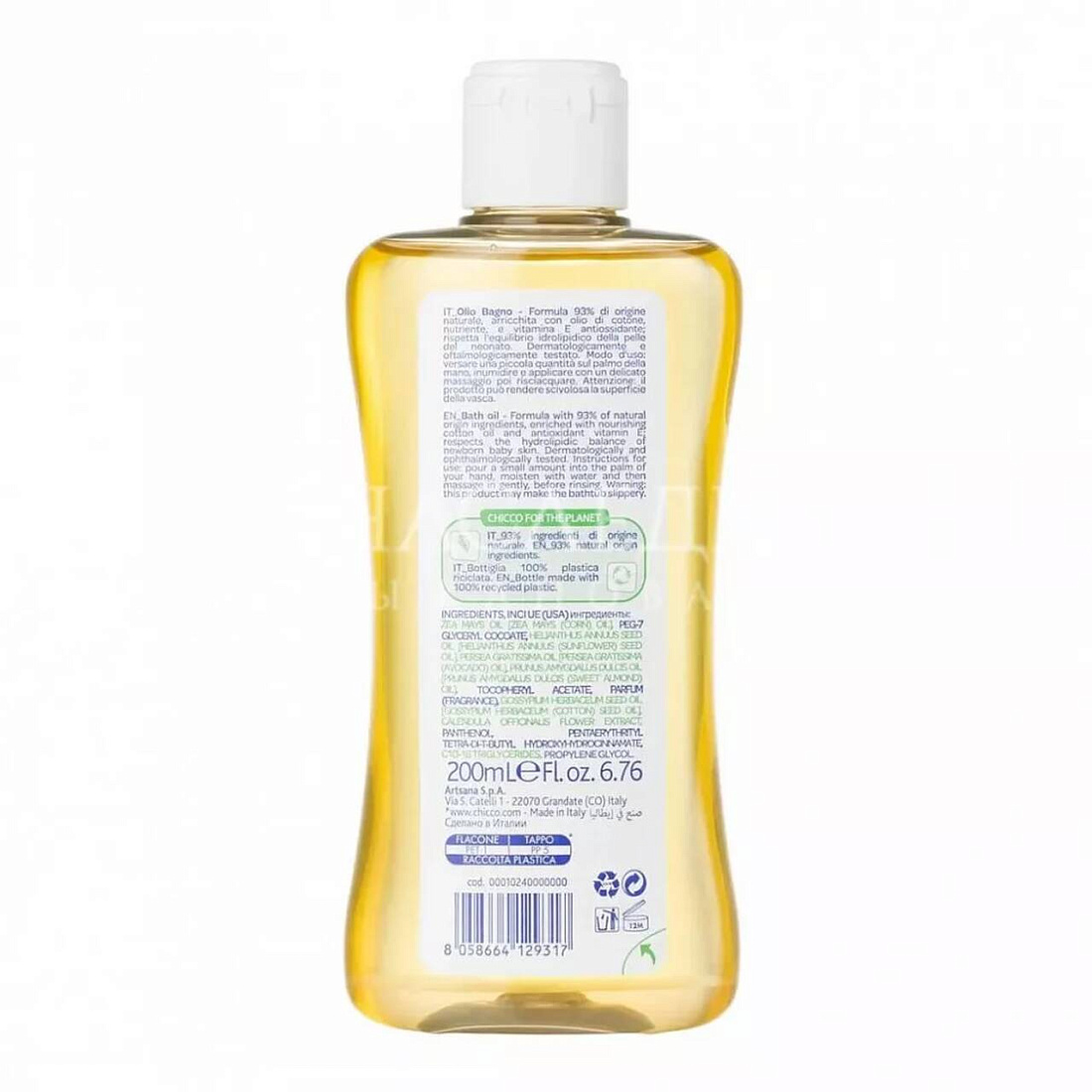 Масло для купания младенцев Chicco Baby Moments имеет экстра нежную формулу, очищает чувствительную кожу ребенка, не нарушая ее хрупкий гидролипидный баланс. Смывается водой, оставляя кожу чистой и увлажненной. Масло для купания детей на основе масел кукурузы, подсолнечника, авокадо и миндаля не содержит минерального масла. Нежное масло на 93% состоит из натуральных ингредиентов, обеспечивающих гидролипидный баланс кожи новорожденного, имеет очень мягкую текстуру и предотвращает раздражение кожи во время купания. Масло для купания младенцев, обогащенное хлопковым маслом и витамином Е, прошло дерматологические испытания и нежно питает чувствительную кожу малышей. Упаковка средства на 100% состоит из переработанного пищевого пластика и пригодна к повторной переработке. Косметика Chicco Baby Moments создана обеспечить бережный, безопасный уход за малышом с самого рождения. Все средства Chicco Baby Moments производятся в Италии, не содержат парабенов, не содержат лаурил- и лауретсульфатов натрия (SLS/SLES), со