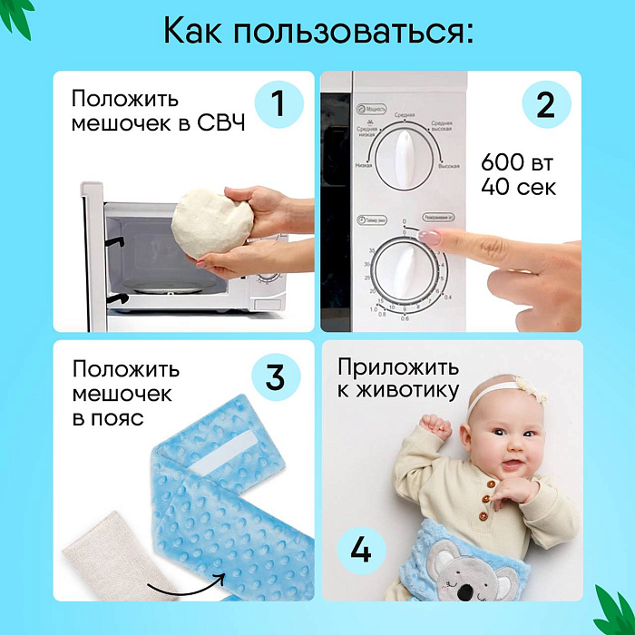 Внутри грелки от колик находятся вишневые косточки, надежно спрятанные в льняной подушечке. Нагревая косточки в микроволновой печи в течении 30 секунд вы получаете грелку, которую можно использовать при дискомфорте в животе у детей первого года жизни.