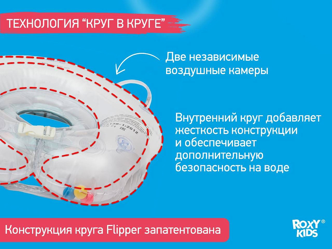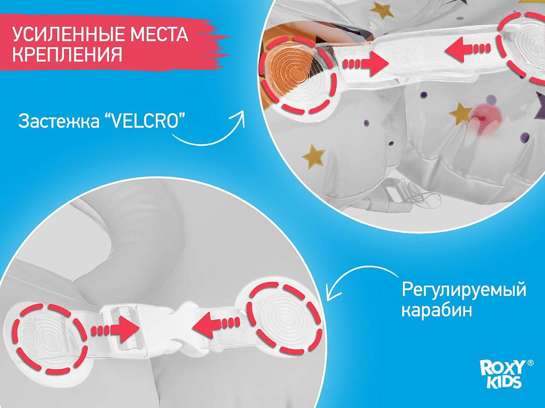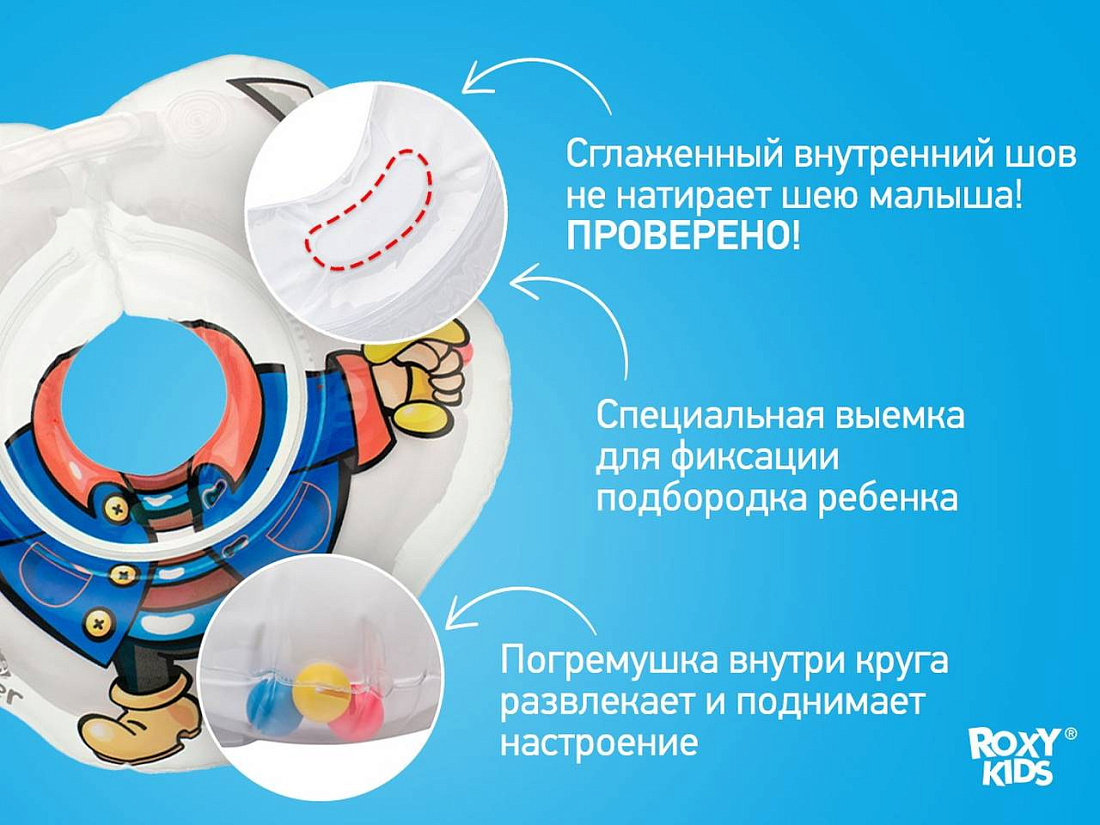 - две надежные застежки для быстрой и простой фиксации круга на шее малыша. Места крепления застеж