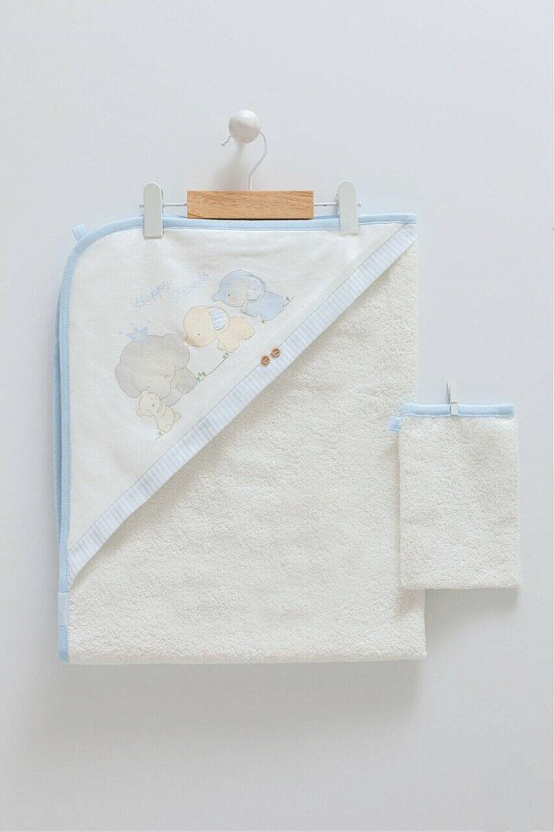 Полотенце с уголком "Слоники"+рукавичка, 82*90, цв. экрю/голубой