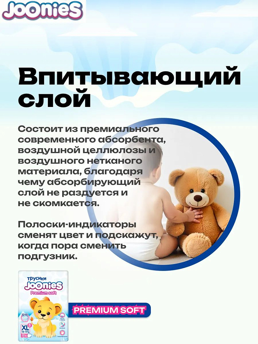 Трусики Joonies Premium Soft стали ещё лучше – в них добавлено больше абсорбента, чтобы ультратонкие трусики впитывали еще больше жидкости. Внешняя поверхность трусиков напоминает кашемир, они очень приятны телу и не заметны под одеждой. Равномерное впитывание по всей поверхности внутреннего слоя позволяет малышу чувствовать себя комфортно в трусиках до 12 часов. 3D рельеф внутренней поверхности уменьшает площадь касания подгузника с кожей ребенка, что помогает избежать раздражения. Благодаря двухслойному материалу, поверхность всегда остается сухой. Впитывающий слой трусиков состоит из премиального современного абсорбента, воздушной целлюлозы и воздушного нетканого материала, благодаря чему абсорбирующий слой не раздуется и не скомкается. Полоски-индикаторы сменят цвет и подскажут, когда пора сменить подгузник. У каждого размера теперь свой милейший дизайн трусиков.