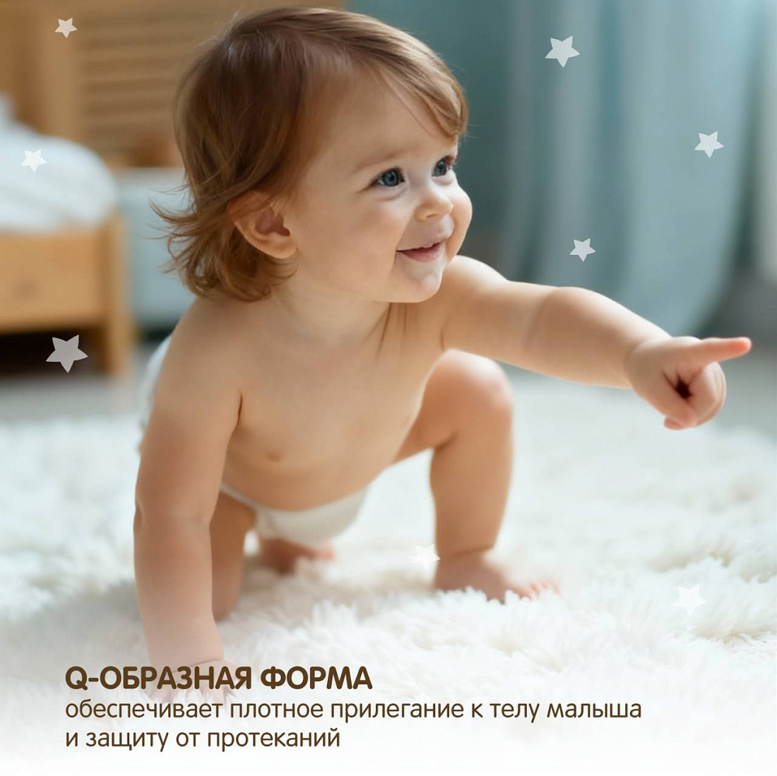 - Анатомическая форма и мягкая поверхность подгузника обеспечивают комфортное прилегание.