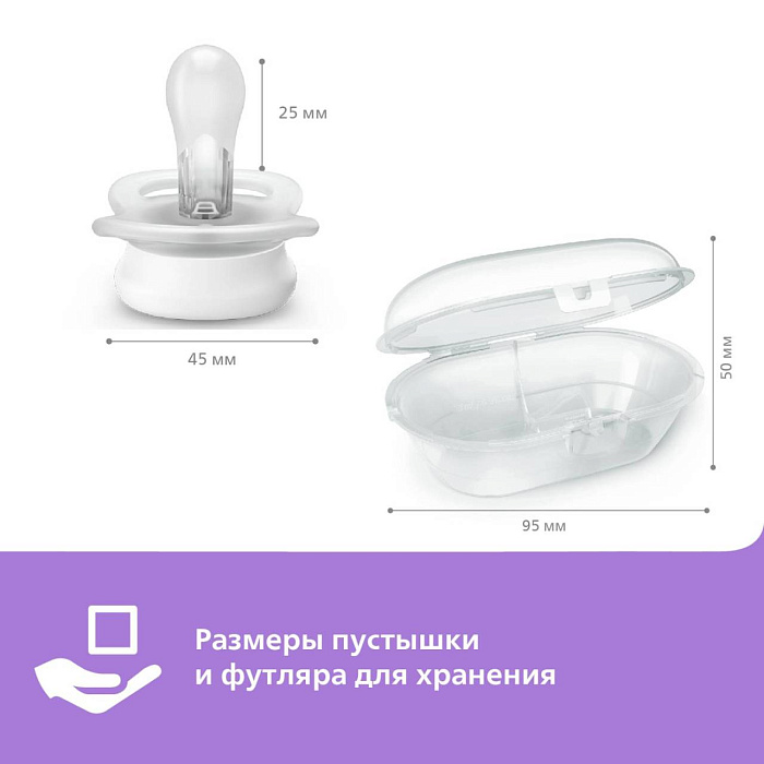 Пустышка для новорожденных предназначена специально для самых маленьких детей. Благодаря легкому корпусу без кольца она станет идеальной первой пустышкой и подойдет малышам в возрасте до 6 месяцев. Форма и размер соски помогут легко перевести малыша на пустышки Philips Avent серий ultra air и ultra soft, чтобы ему всегда было комфортно.