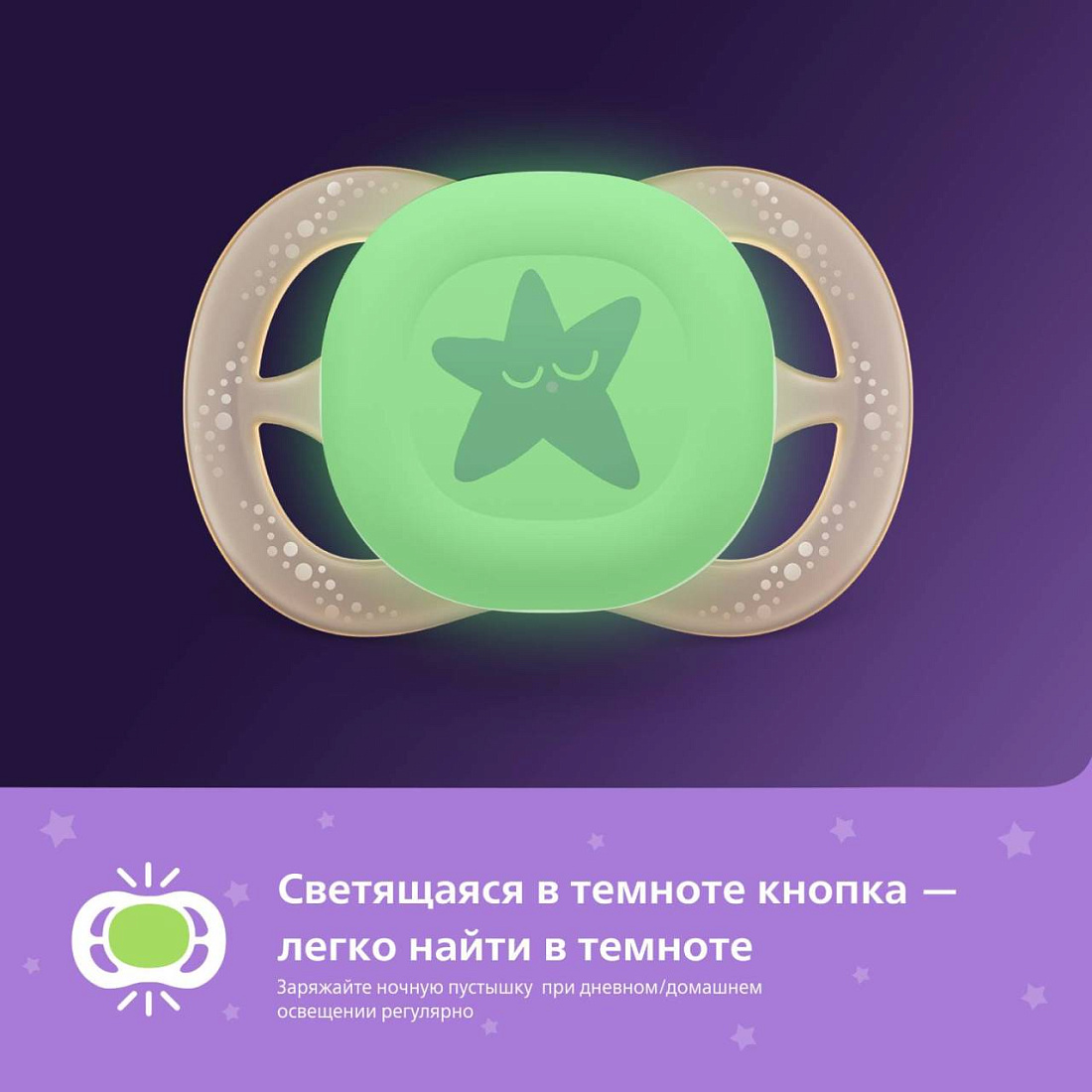 Компактная и легкая соска-пустышка Philips Avent u ltra s tart Night успокаивает малышей уже с первых дней жизни. Пустышка Philips Avent предназначена для новорожденных, но ее можно использовать и до 6 месяцев. Кто бы ни сидел с ребенком, малыш сможет ощутить невероятный комфорт! На пустышке есть светящаяся в темноте кнопка, которая позволяет найти пустышку при выключенном свете. Свечение в темноте происходит за счет безопасного флуоресцентного компонента.