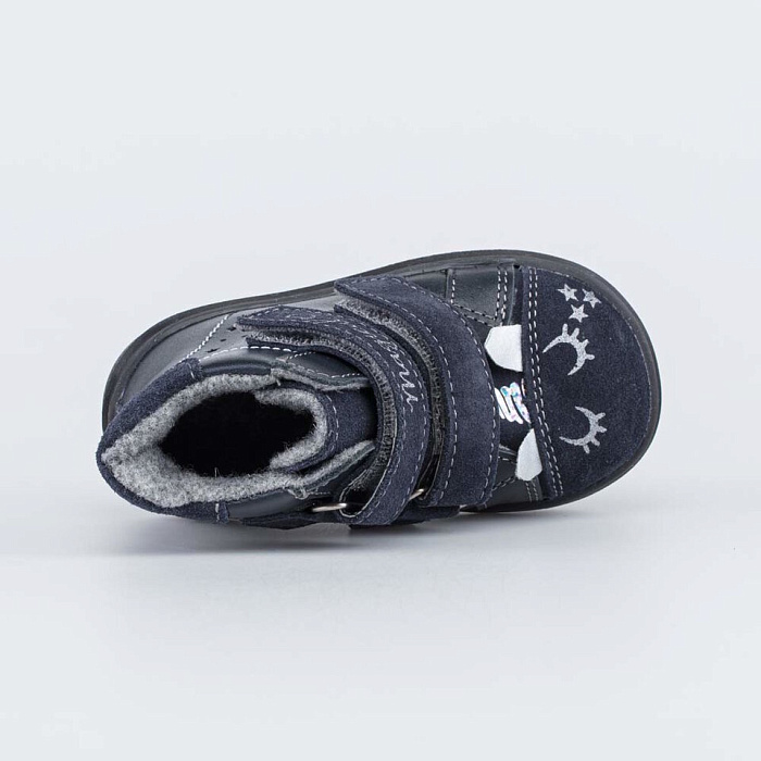 - Элементы декора: серебристый принт с ушками в виде единорога, перфорированная звездами кожа на внешней стороне ботинка, стильная надпись на липучке Magical.