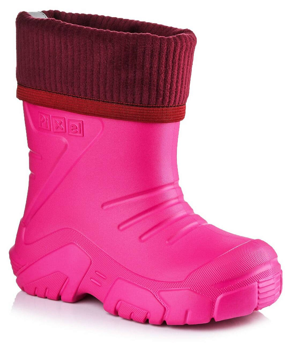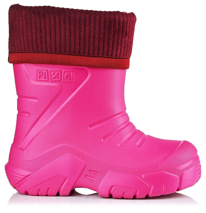 Сапоги Pixel Dr.Rain FLEECE line — это сапоги, внешний вид которых знаком розничным покупателям, но сапог Pixel Dr.Rein отличается биомеханическими свойствами и помогает ребёнку уверенно ходить. Линии на союзке продуманы так, чтобы голенище лёгко сгибалось, следуя за движениями ноги. Комбинированный протектор на подошве хорошо сцепляется с поверхностью, боковые ступеньки не собирают грязь в подошве. Ступенчатый выступ Safe Fun помогает легко снимать сапоги, и амортизирует удары, когда ребёнок активно болтает ногами. Оригинальные линии создают современный силуэт, а сочетание гладкой и шероховатой фактур привлекают внимание, завершает композицию сапога ягодный розовый. Съёмный чулок с вельветовым отворотом создаёт ощущение безопасности и комфорта: - на отвороте пришита светоотражающая лента и ребёнок будет заметен для едущих по тёмным дворам водителей; - ступня ребёнка встречается с мягкой флисовой тканью, стелька дублирована поролоном достаточной толщины, чтобы амортизировать ударную волну шага; - снаружи п