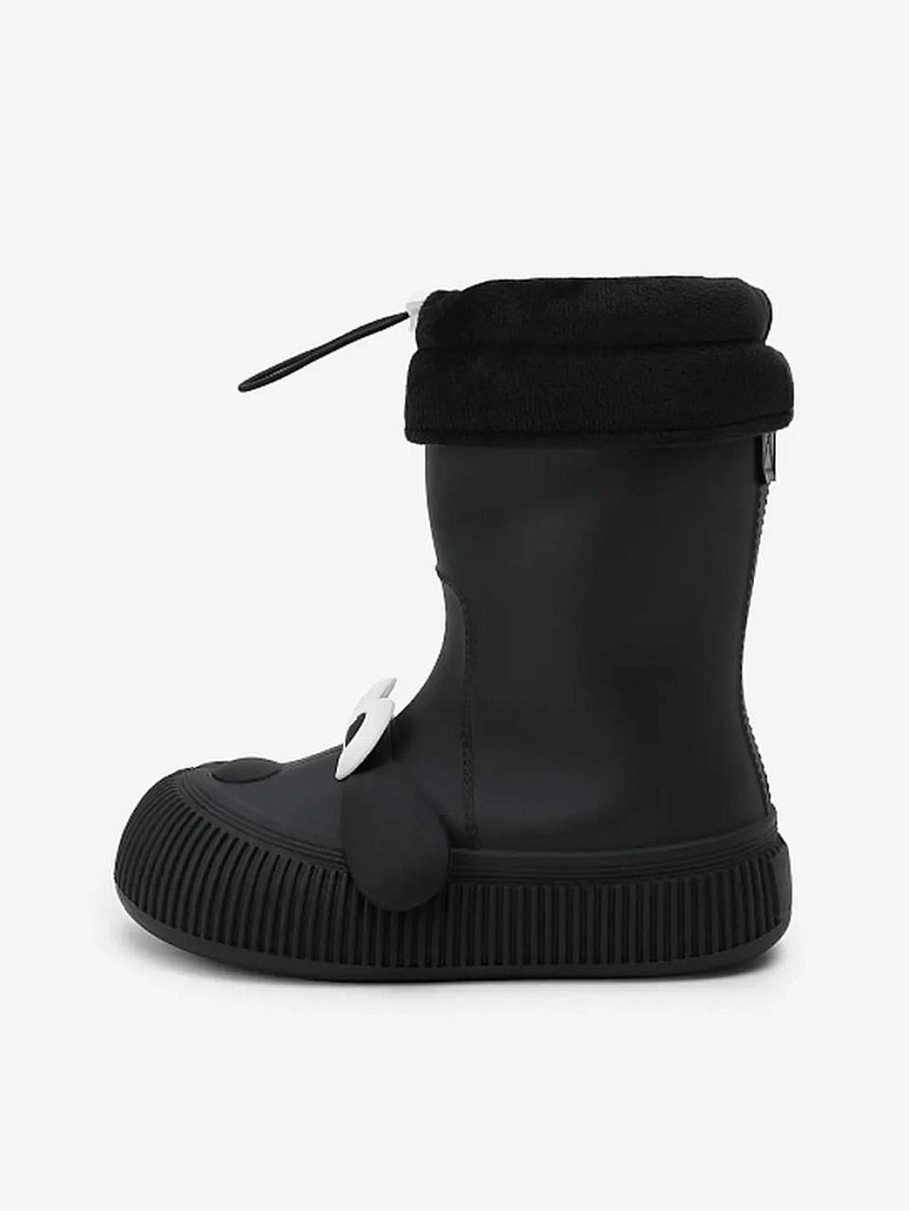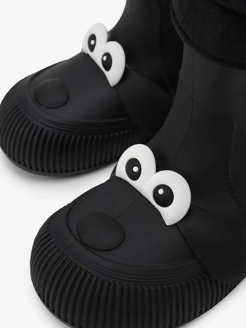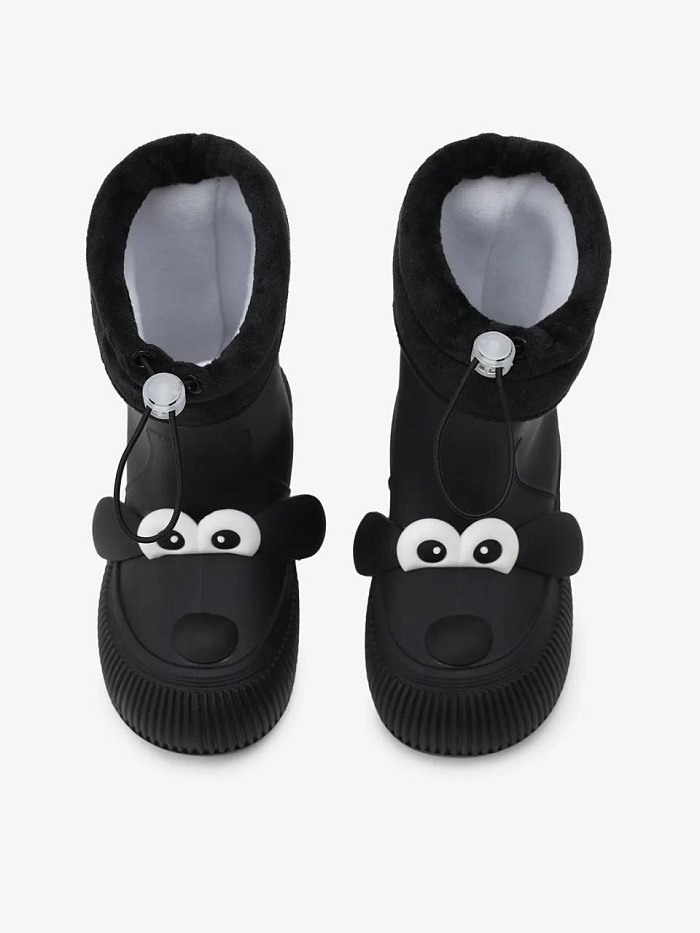 Резиновые сапоги выполнены из ПВХ чёрного цвета. Модель дополнена текстильным отворотом и декором в виде мордочки собаки.