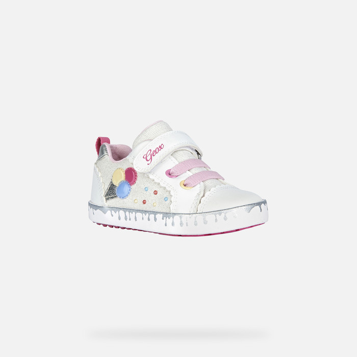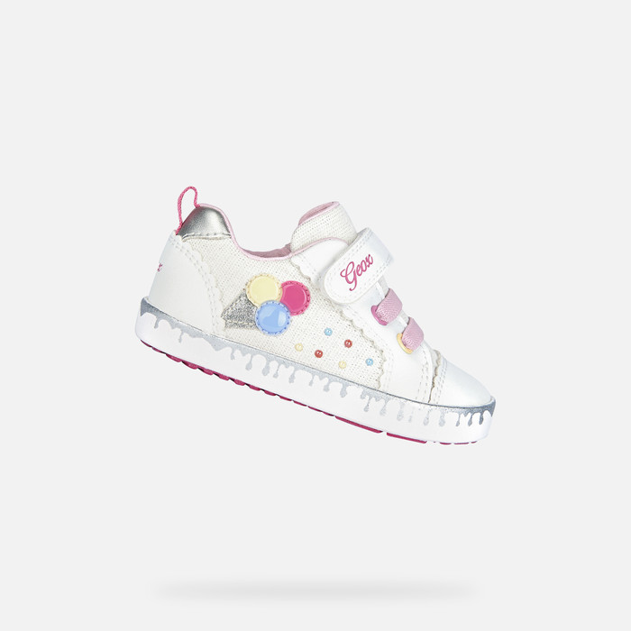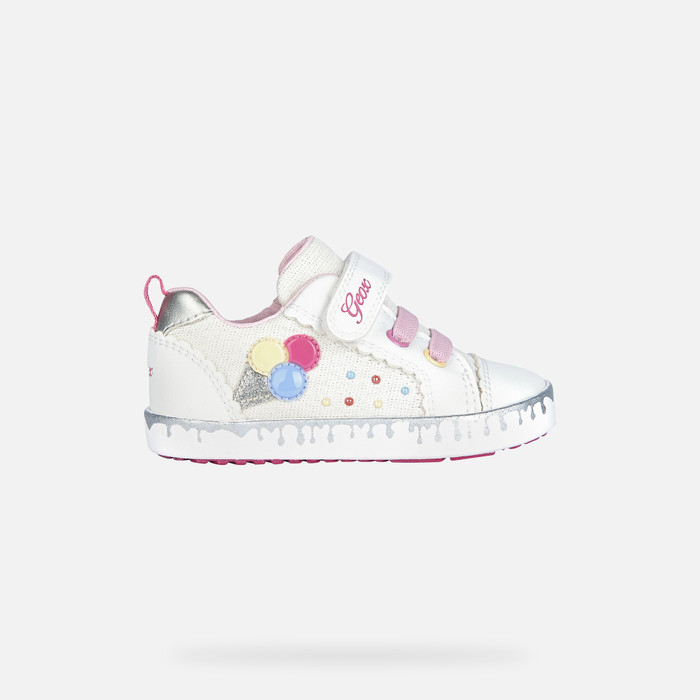 Легкие удобные кроссовки с низким вырезом для девочек в легком и веселом стиле. Белый верх из блестящего полотна и материала с эффектом кожи украшен летним принтом и разноцветными деталями. Разработанные для маленьких ножек, которые постоянно находятся в движении, Kilwi дополнят спортивно-повседневные наряды женственными нотками.
