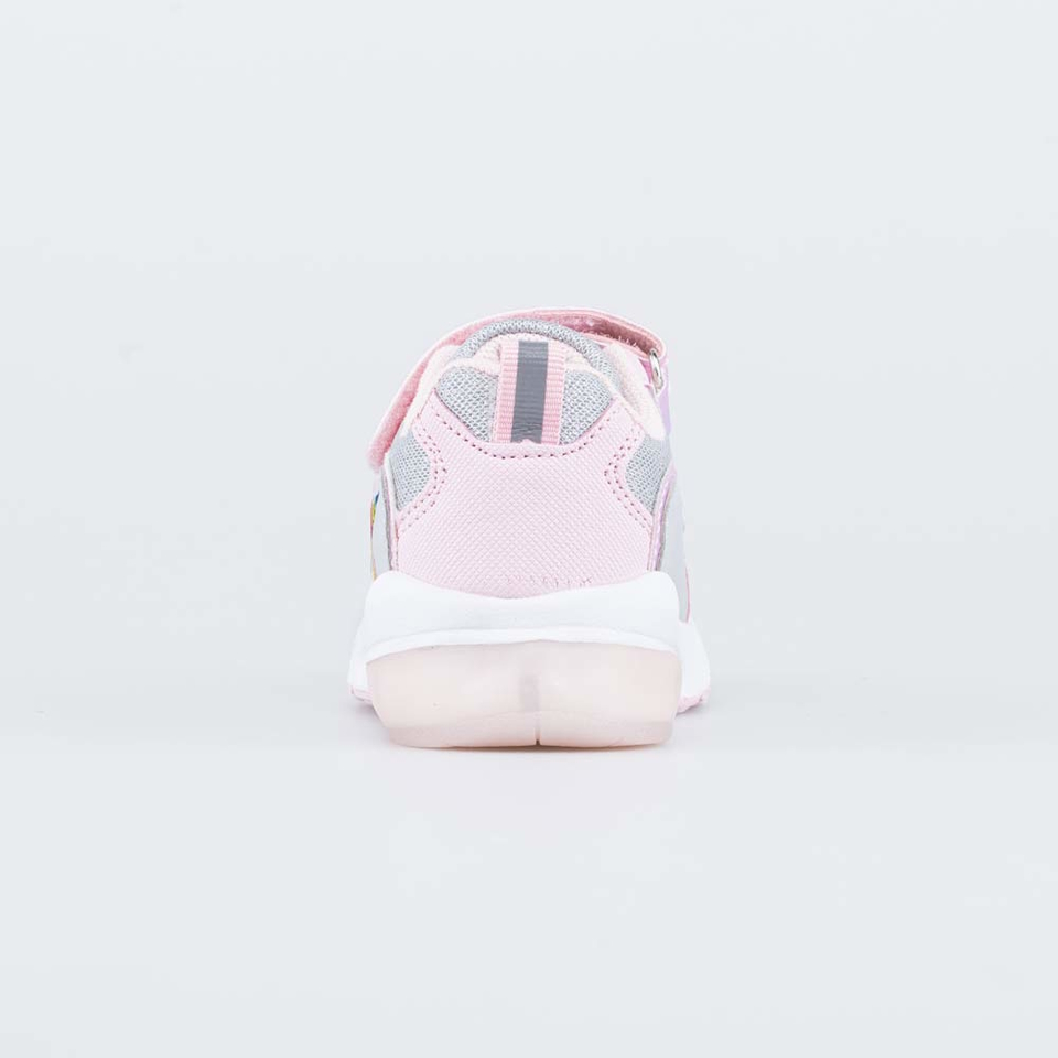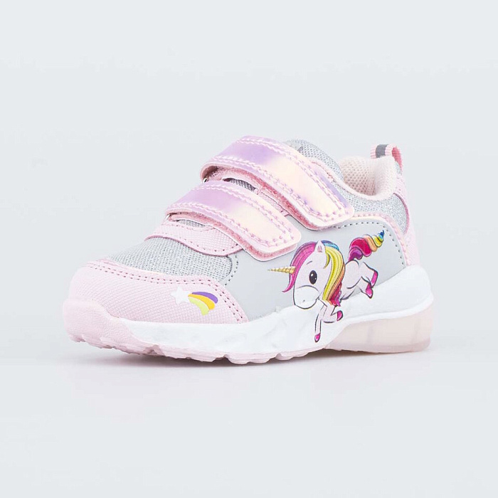 Модель декорирована оригинальным принтом в виде единорога. Массивная двухцветная подошва оснащена мигающими лампочками с яркими светодиодами.