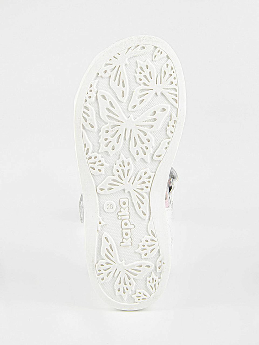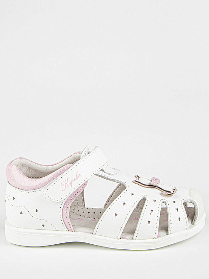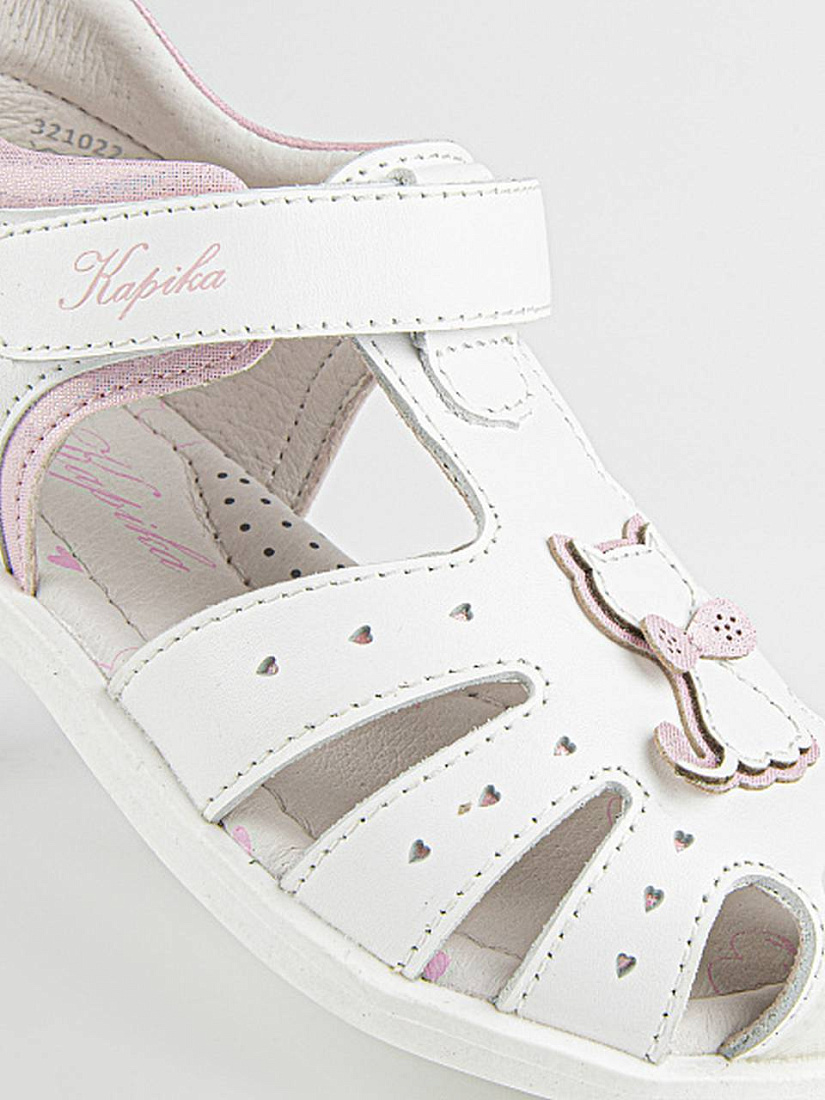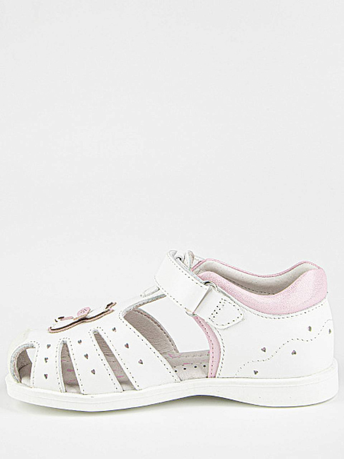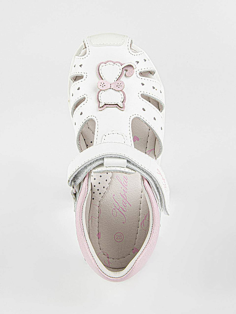 Закрытые сандалии белого цвета с розовым кантом и аппликацией. Выполнены полностью из натуральной кожи. Прочная и устойчивая подошва из термоэластопласта. Внутри имеется подсводник, который поддерживает продольный свод стопы и обеспечивает правильное положение ноги ребенка при ходьбе.