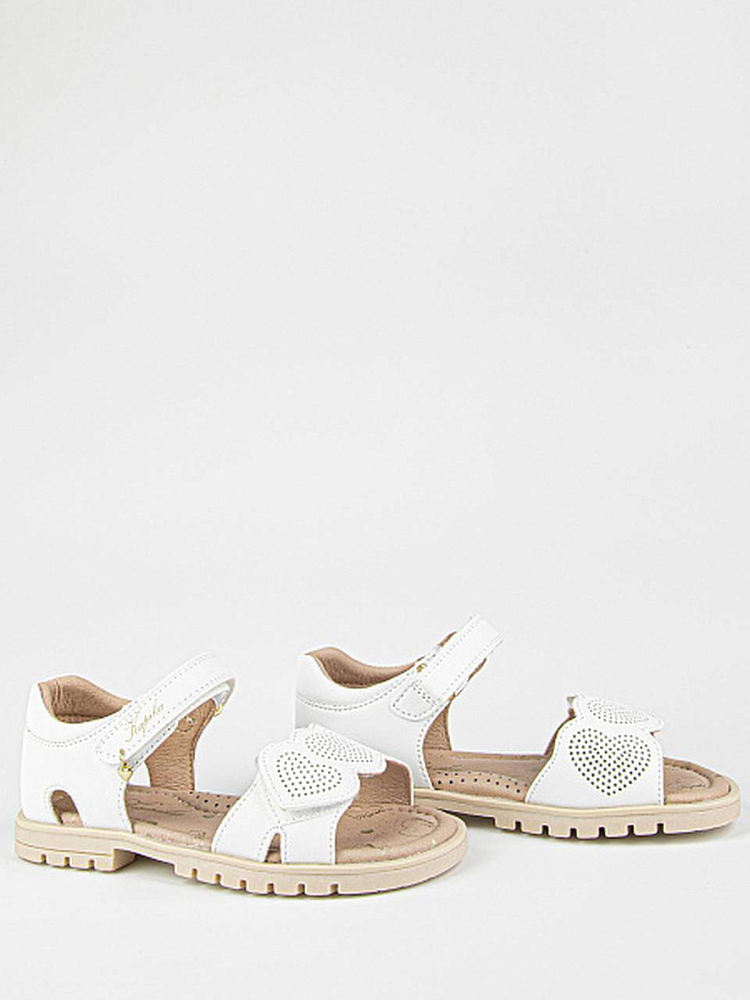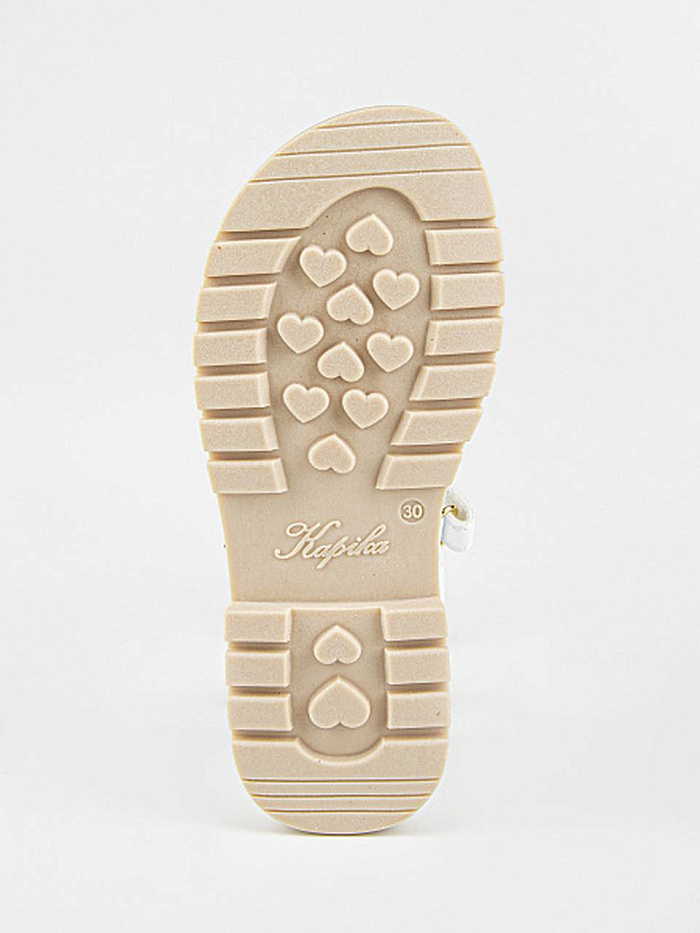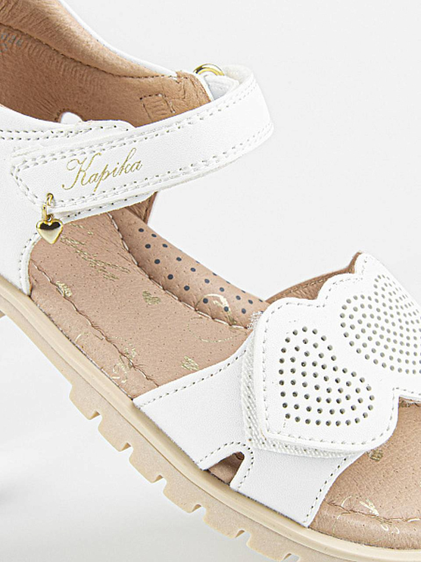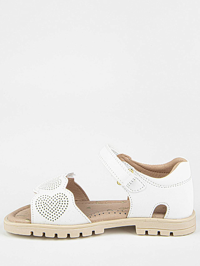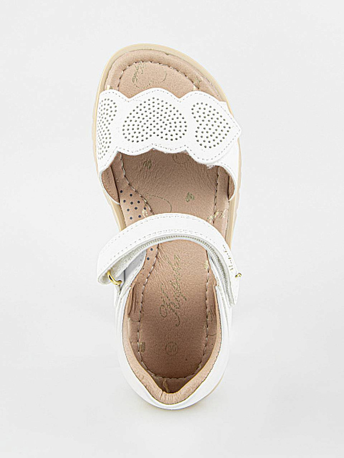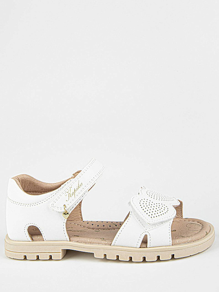 Лаконичные сандалии белого цвета, декорированные аппликацией. Открытая носочная часть и высокая закрытая пятка. Верх изделия выполнен из качественной экокожи. Подкладка и стелька выполнены из натуральной кожи. Прочная подошва из термоэластопласта защитит от неровностей поверхности.