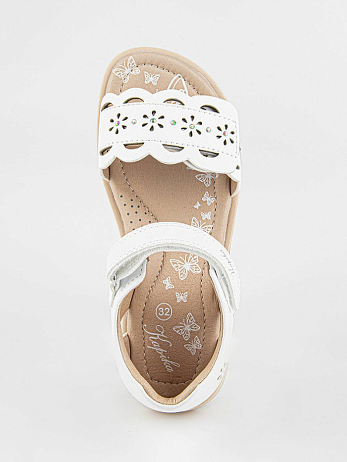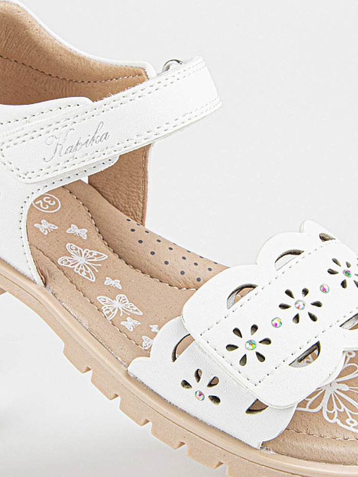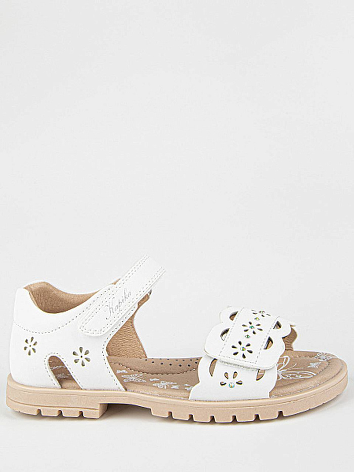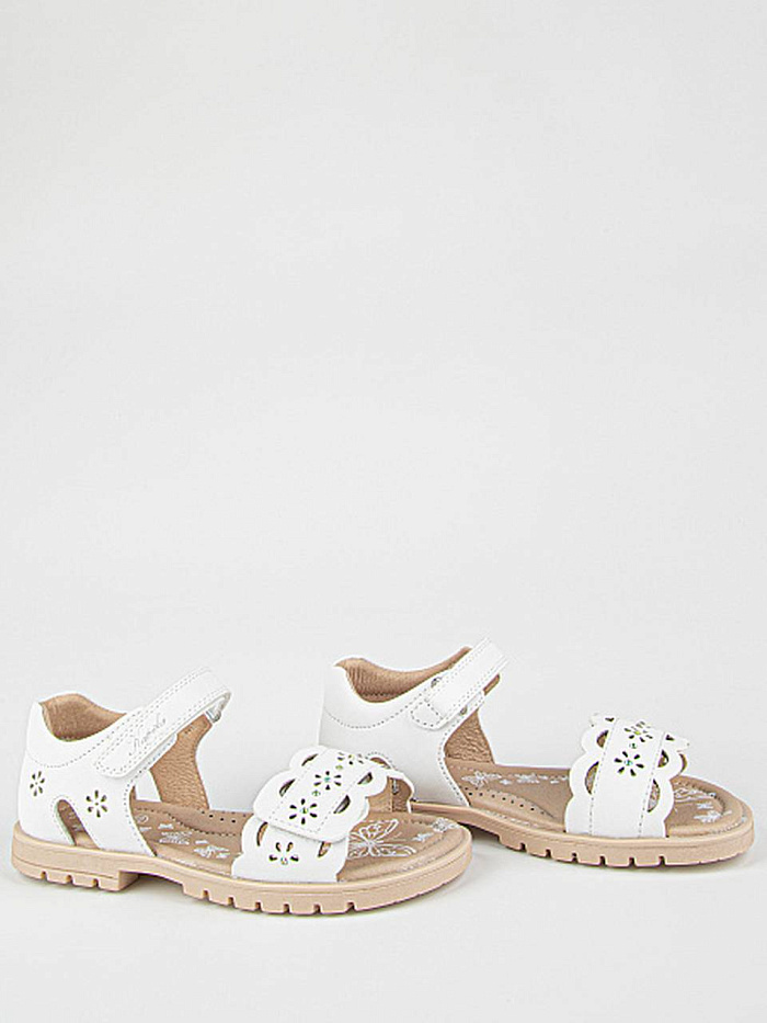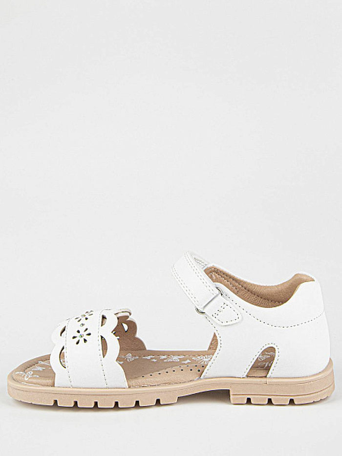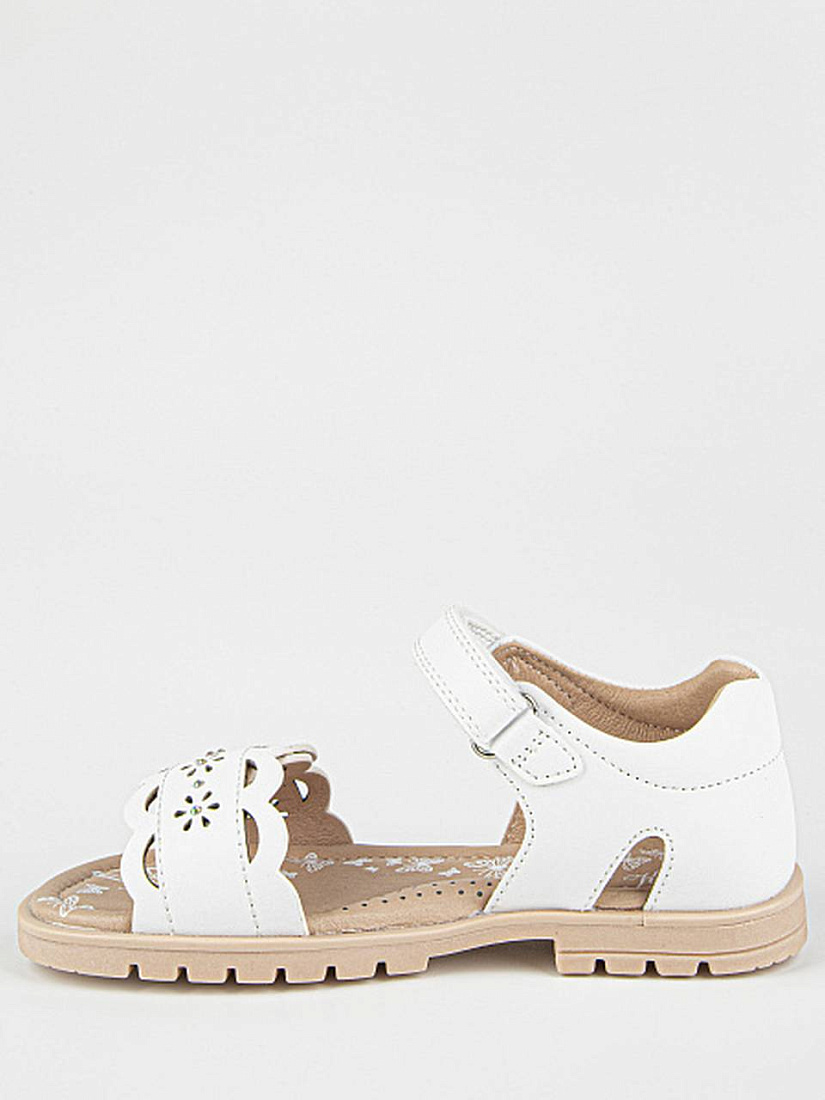 Лаконичная модель сандалий белого цвета, декорированная перфорацией. Верх выполнен из качественной экокожи. Подкладка и стелька из натуральной кожи обеспечат комфорт и экологичность. Прочная и долговечная подошва из термоэластопласта защитит от неровностей поверхности.