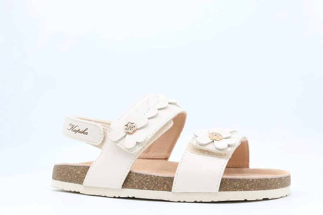 Открытые легкие сандалии белого цвета. Пробковая стелька модели покрыта подкладкой из натуральной кожи. Верх выполнен из качественной экокожи. Легкая и гибкая подошва ЭВА обеспечивает амортизацию при ходьбе.