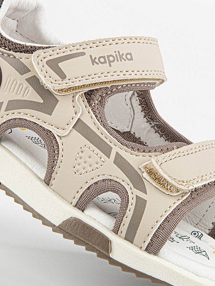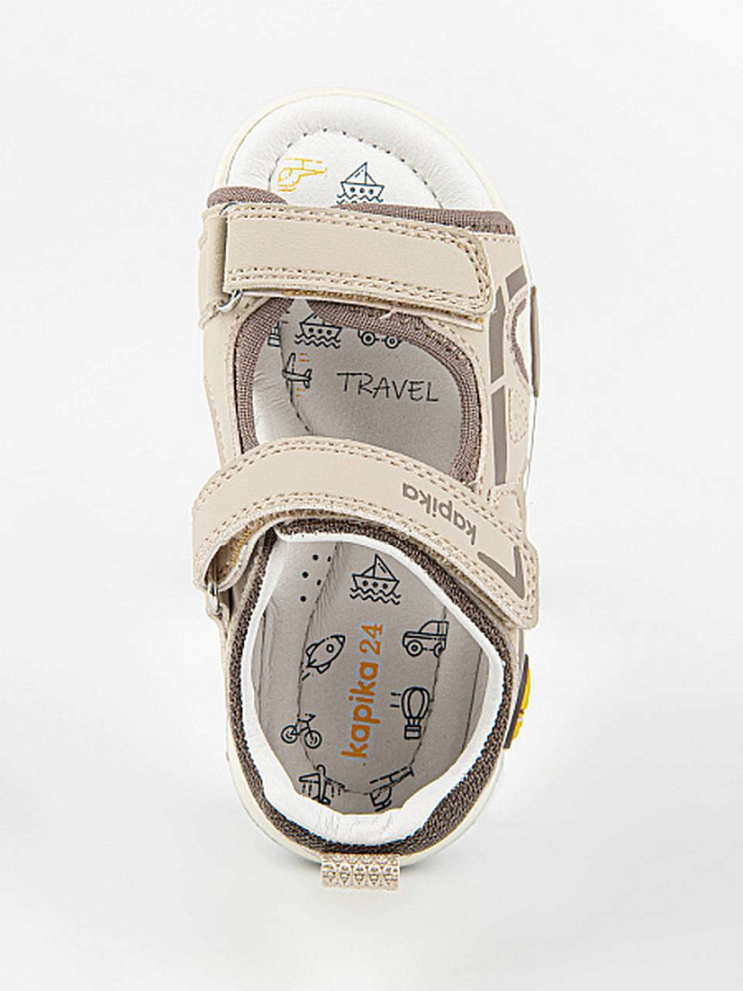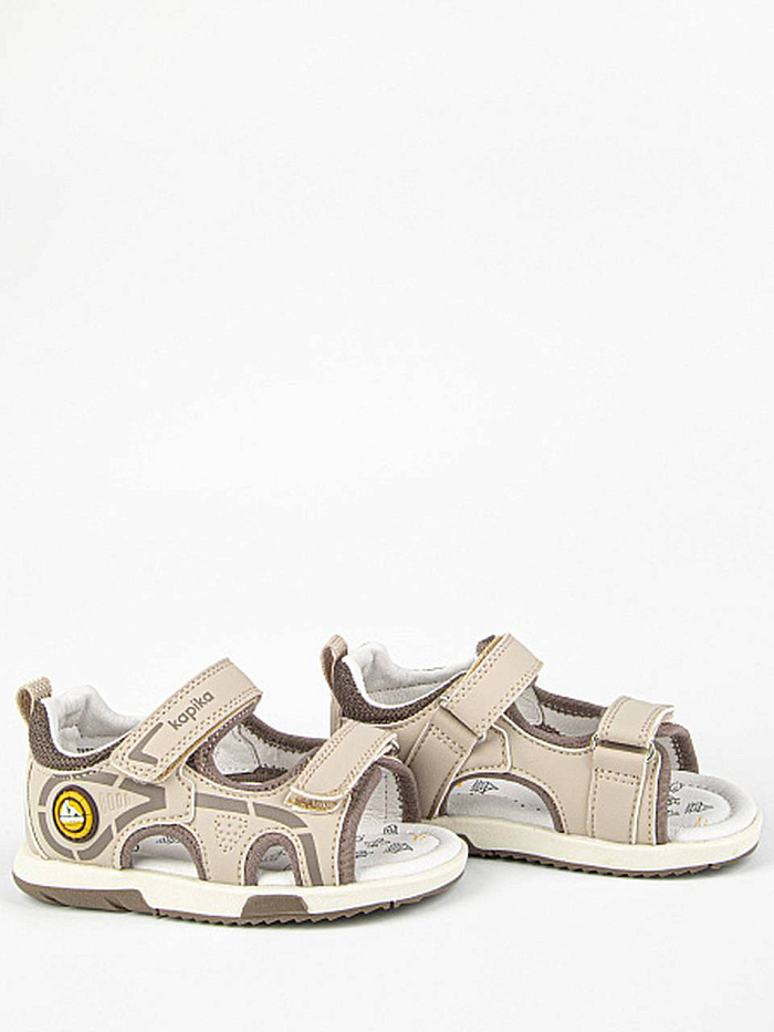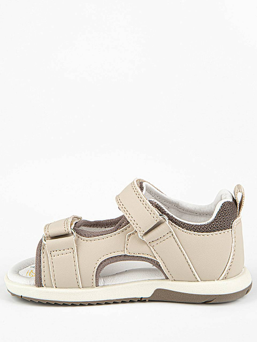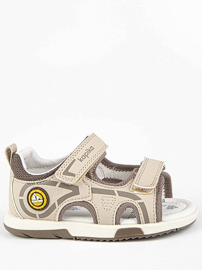 Сандалии бежевого цвета для мальчика, в спортивном стиле. Липучки надежно фиксируют модель на ножке. Открытая носочная часть и высокая закрытая пятка. Верх выполнен из качественной экокожи. Стелька и подкладка - из натуральной кожи. Прочная и долговечная подошва из термоэластопласта.
