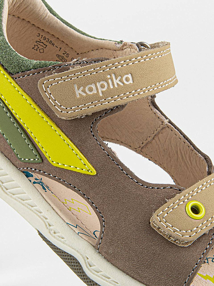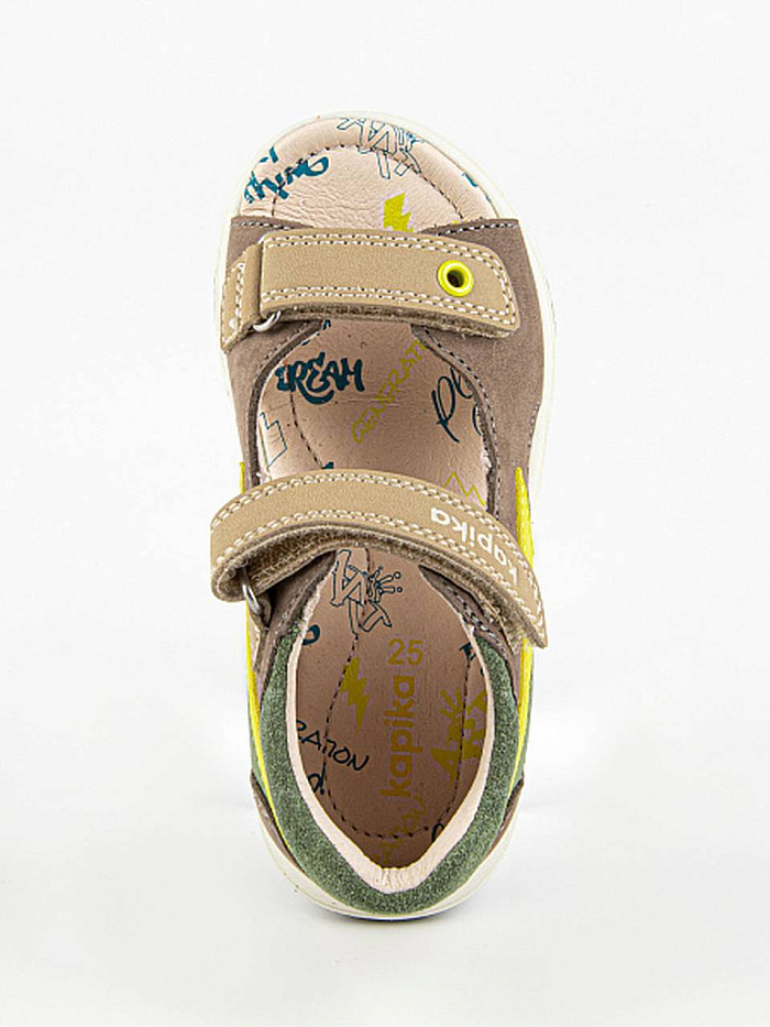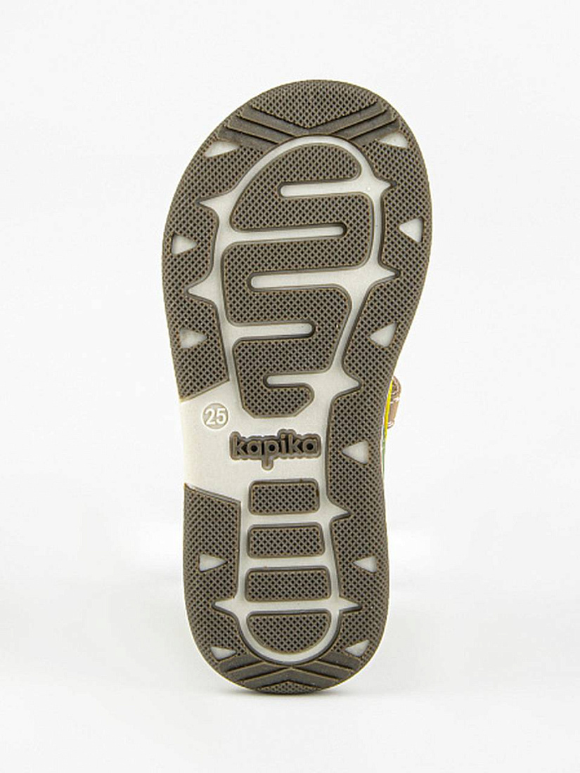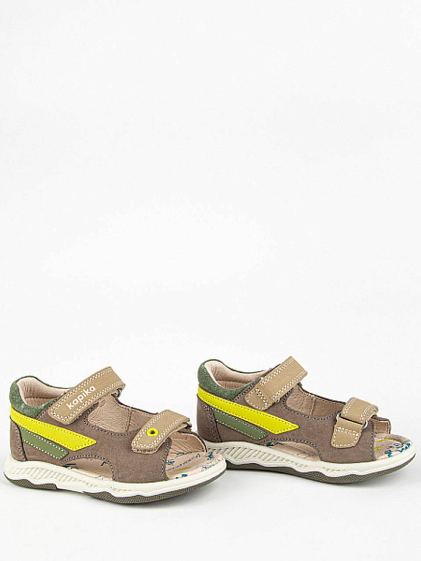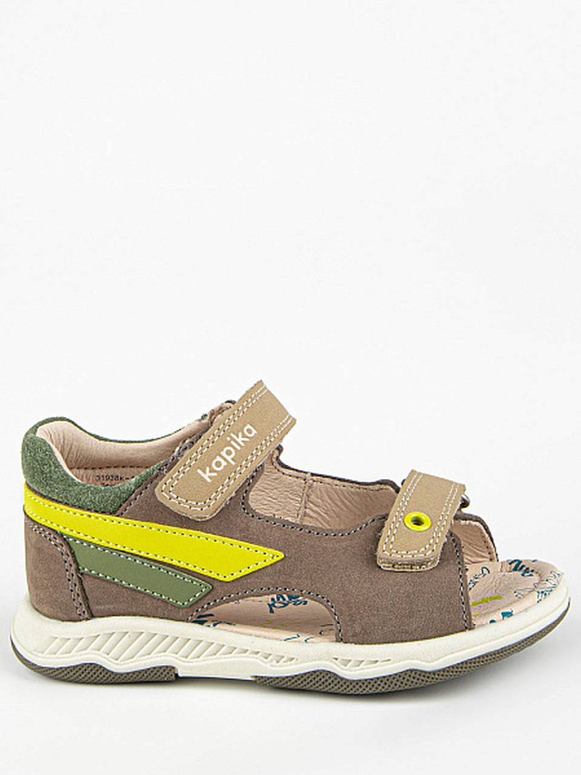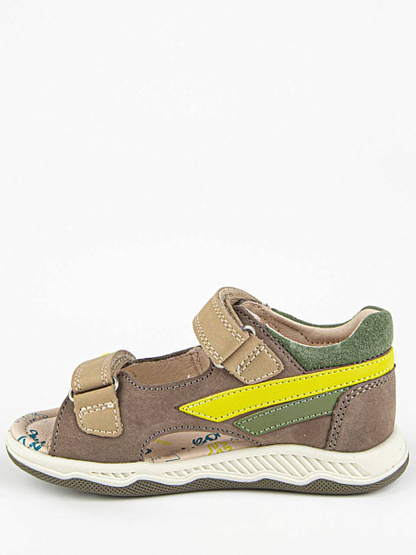 Сандалии светло-коричневого цвета с цветными вставками, с открытой носочной частью и высокой закрытой пяткой. Стелька и подкладка выполнены из натуральной кожи, а верх - из комбинации натуральной и экокожи. Внутри имеется подсводник, который поддерживает продольный свод стопы и обеспечивает правильное положение ноги ребенка при ходьбе. Долговечная подошва из ТЭП продлевает срок службы изделия