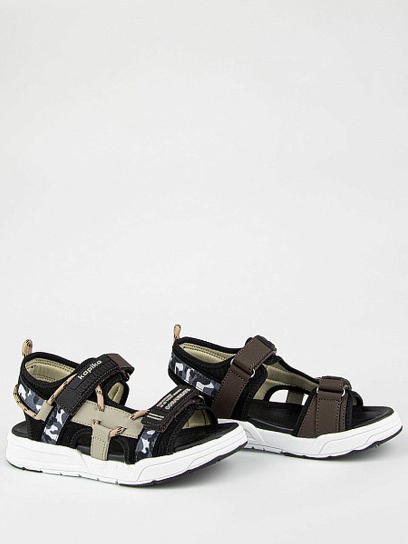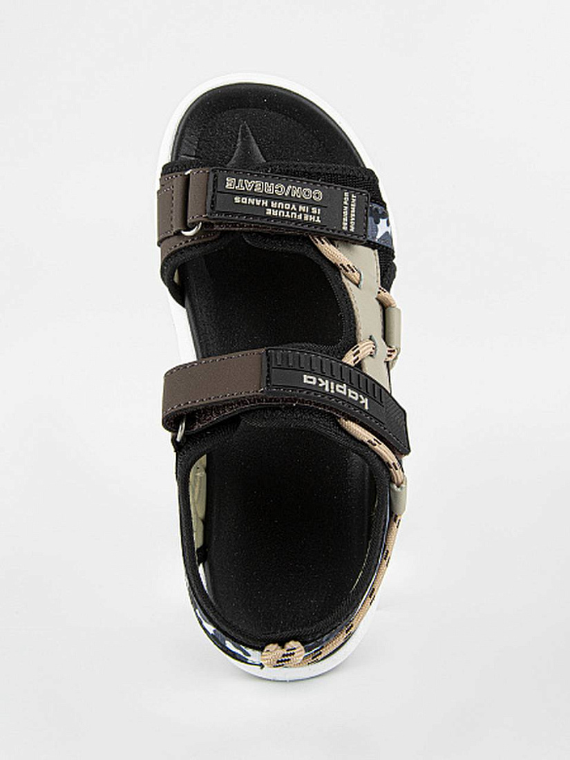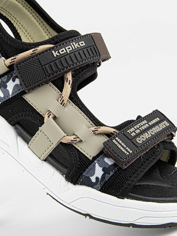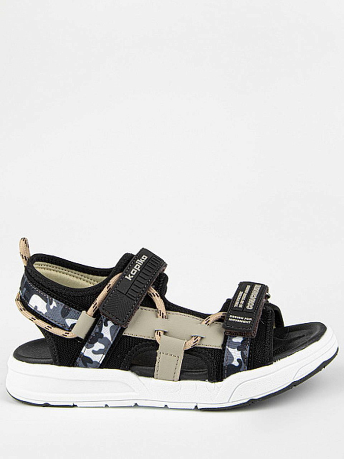 Открытые сандалии черно-бежевого цвета из комбинации текстиля и экокожи. Подкладка текстильная с добавлением хлопка. Стелька из материала ЭВА обладает высокой прочностью и долговечностью, не теряя форму и свои свойства даже при интенсивном использовании. Комбинированная подошва из материалов ЭВА и ТЭП гибкая, легкая и стойкая к износу.