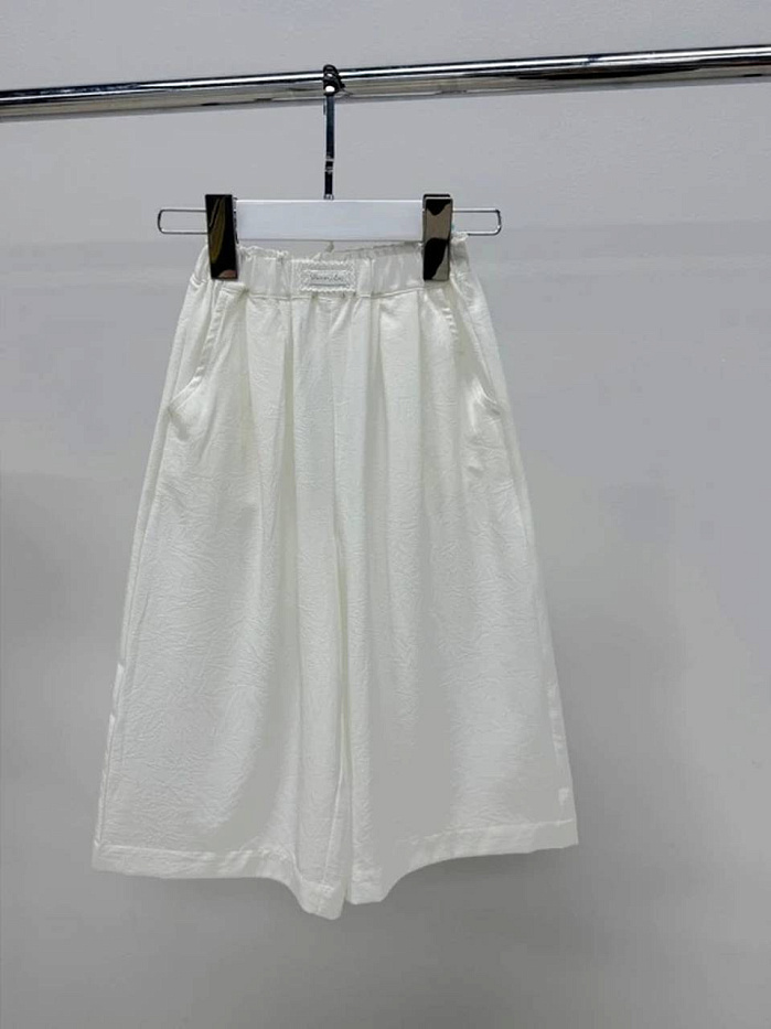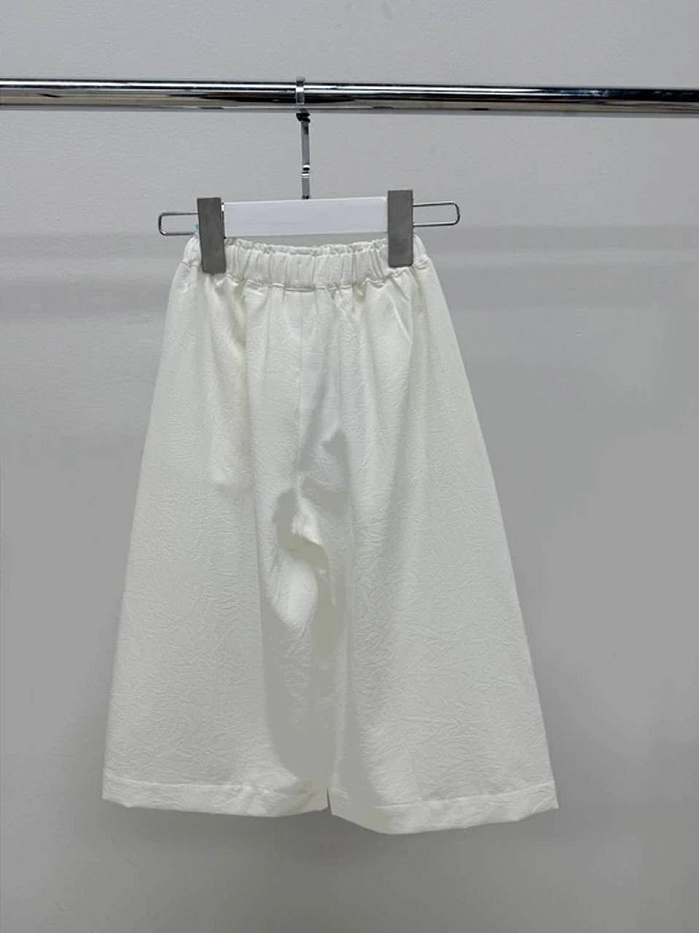 Бермуды для девочки выполнены в универсальном светлом оттенке, что делает их отличным выбором для летнего гардероба. Материал изделия выглядит легким и приятным на ощупь, с деликатной фактурой, которая добавляет изысканности и аккуратности внешнему виду. Дизайн лаконичный и практичный: пояс выполнен на резинке, что обеспечивает комфортную посадку и удобство при носке. Передняя часть бермуд украшена аккуратными складками, визуально придающими изделию объем и стильную форму. На фото заметно, что конструкция предусматривает свободный крой, не стесняющий движения, что особенно важно для активных детей. Длина бермуд чуть ниже колена, благодаря чему они отлично подходят для прогулок, занятий спортом или отдыха. Цвет ткани однородный, без лишних декоративных элементов, что позволяет сочетать бермуды для девочки с различными футболками, блузками или топами. Качественный пошив обеспечивает долгий срок службы, а эластичный пояс позволяет легко надевать и снимать изделие самостоятельно.