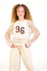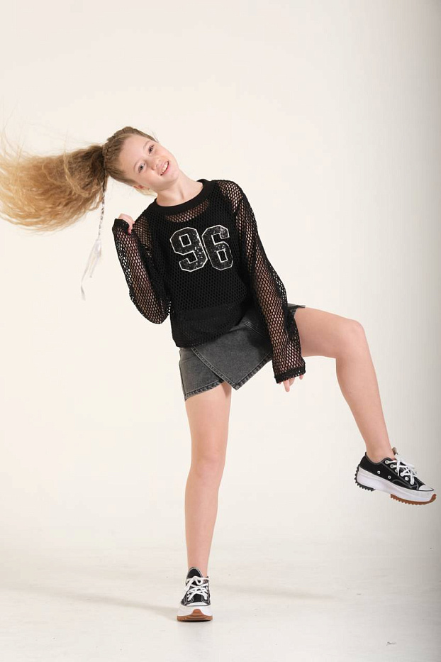 Блузка для девочки выполнена из сетчатого материала, что обеспечивает легкость и отличную вентиляцию в течение всего дня. Изделие представлено в черном цвете, создающем стильный и современный образ. На передней части блузки крупный принт с числом "96", который придает изделию модный спортивный акцент и подчеркивает индивидуальность. Свободный крой обеспечивает комфортную посадку и свободу движений, что особенно важно для активной девочки. Длинные рукава делают блузку универсальной для разных сезонов, позволяя носить ее как самостоятельно, так и в сочетании с майкой или футболкой. Сетчатая текстура ткани добавляет изделию оригинальности и делает его привлекательным для подростков, следящих за модой. Горловина выполнена в классическом стиле, не стесняет движения и сохраняет аккуратный внешний вид даже после длительного ношения. Блузка для девочки легко сочетается с джинсами, брюками и юбками, что делает ее отличным выбором для повседневных прогулок, школы или встреч с друзьями.