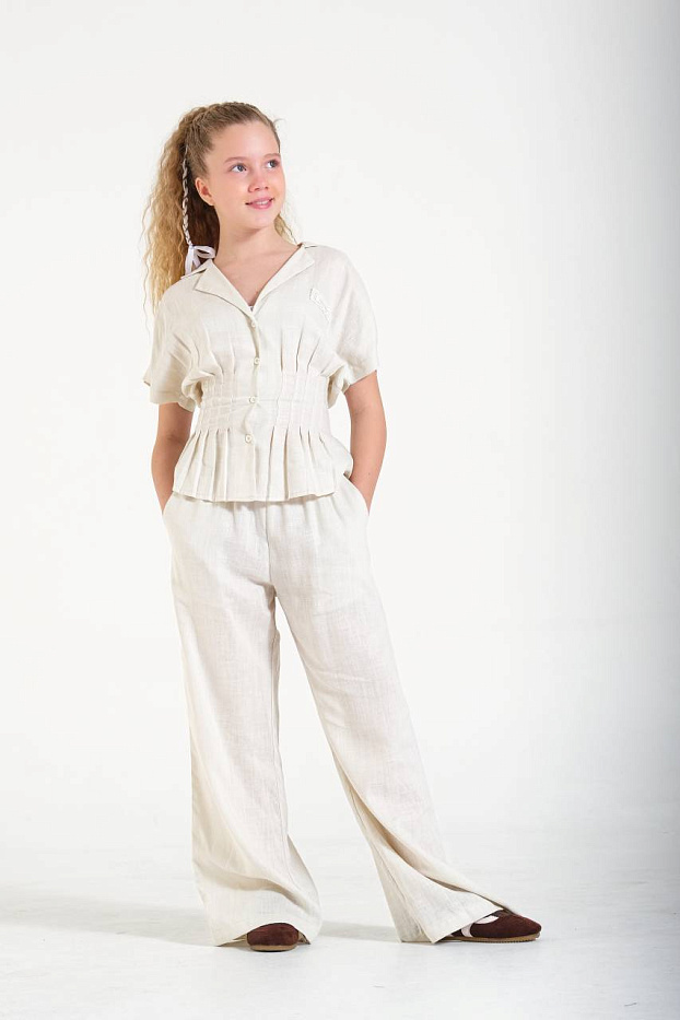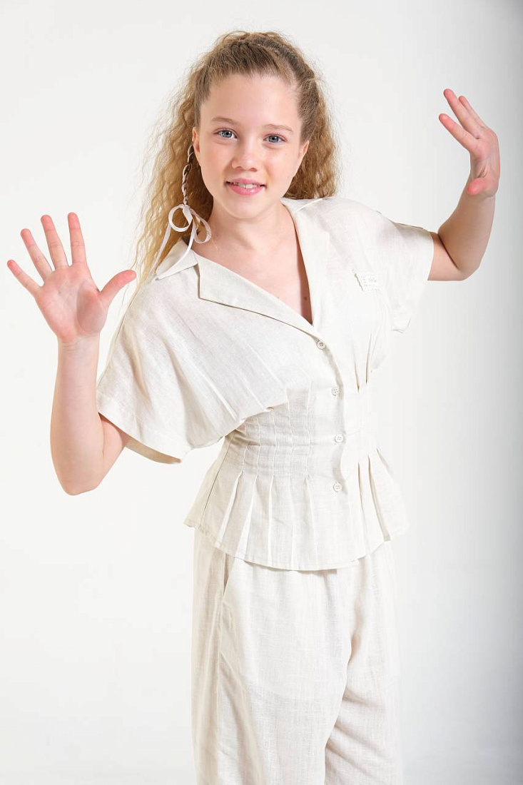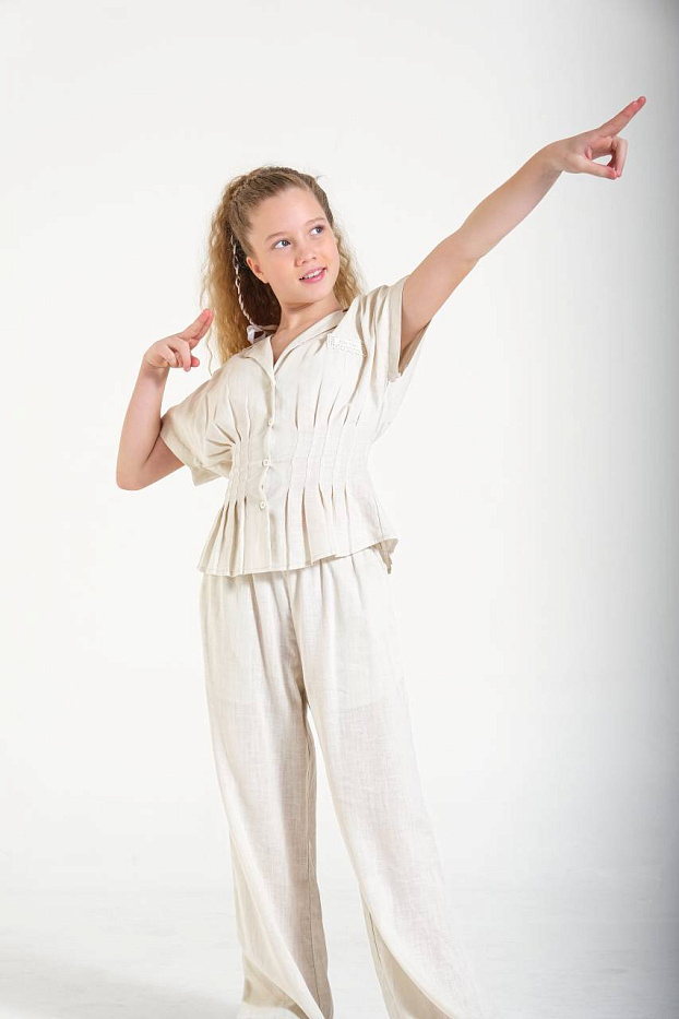 Рубашка для девочки выполнена из легкой ткани светлого оттенка, которая создает ощущение уюта и комфорта при носке. Материал визуально напоминает натуральный хлопок или лен, благодаря чему изделие отлично подходит для повседневной носки и активного отдыха. Дизайн рубашки отличается короткими рукавами, что делает ее универсальным вариантом для теплого времени года. Приталенный крой с эластичной вставкой на талии подчеркивает фигуру и создает аккуратный силуэт. В нижней части рубашки присутствует декоративная сборка, добавляющая объем и визуальный интерес. Классический отложной воротник придает модели завершенный и аккуратный вид. Застежка на пуговицы спереди обеспечивает удобство при переодевании. Ткань смотрится матовой, мягкой и приятной на ощупь, а сама конструкция позволяет свободно двигаться и чувствовать себя комфортно в течение всего дня.