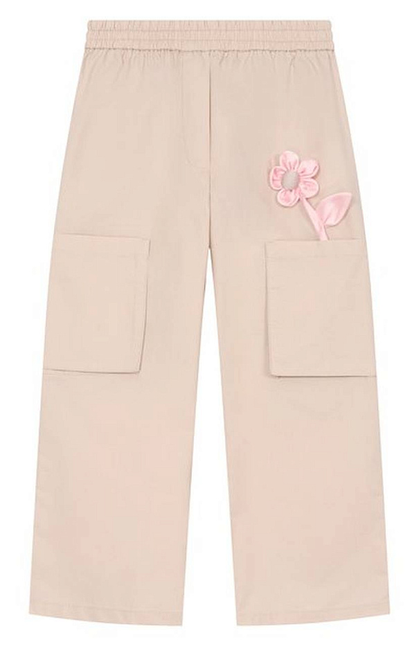 Широкие брюки с эластичным поясом выполнили из чистого хлопка. Модель с накладными карго украсили объемной атласной аппликацией в виде цветка.
