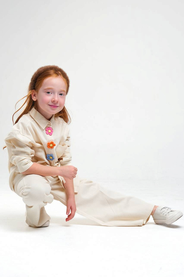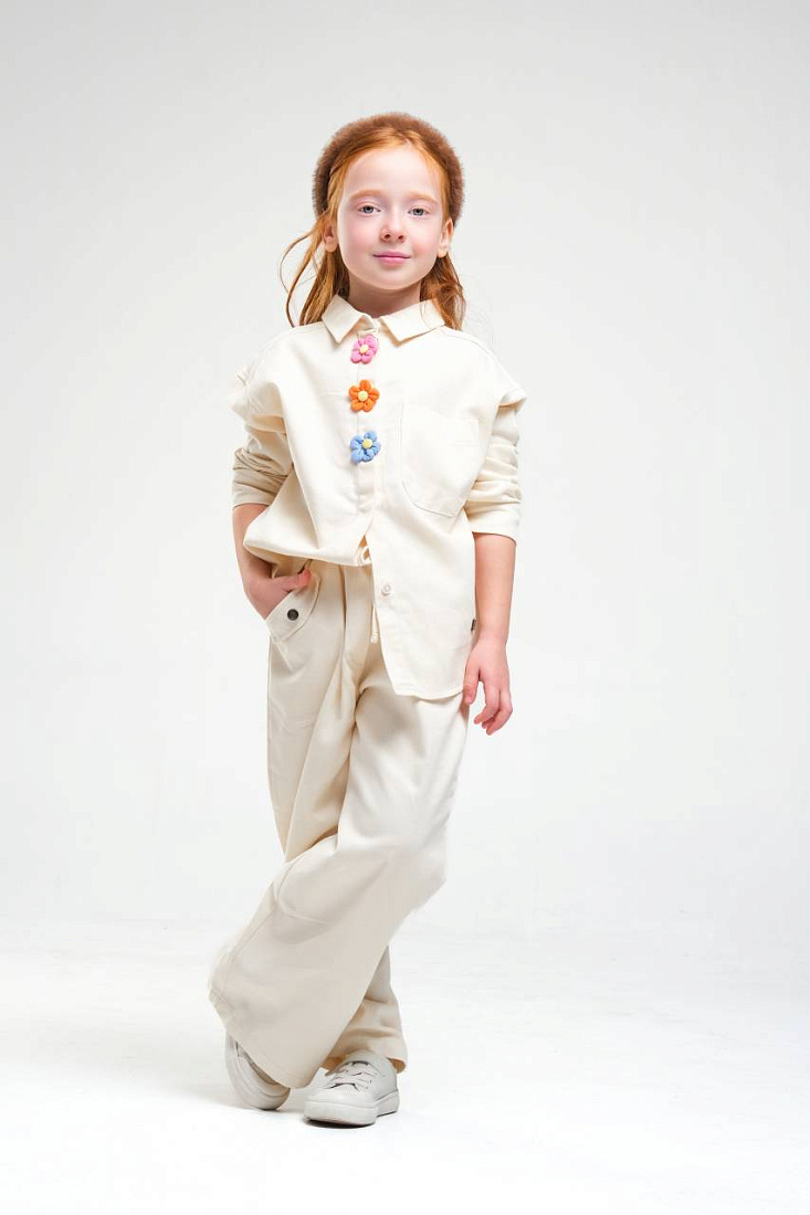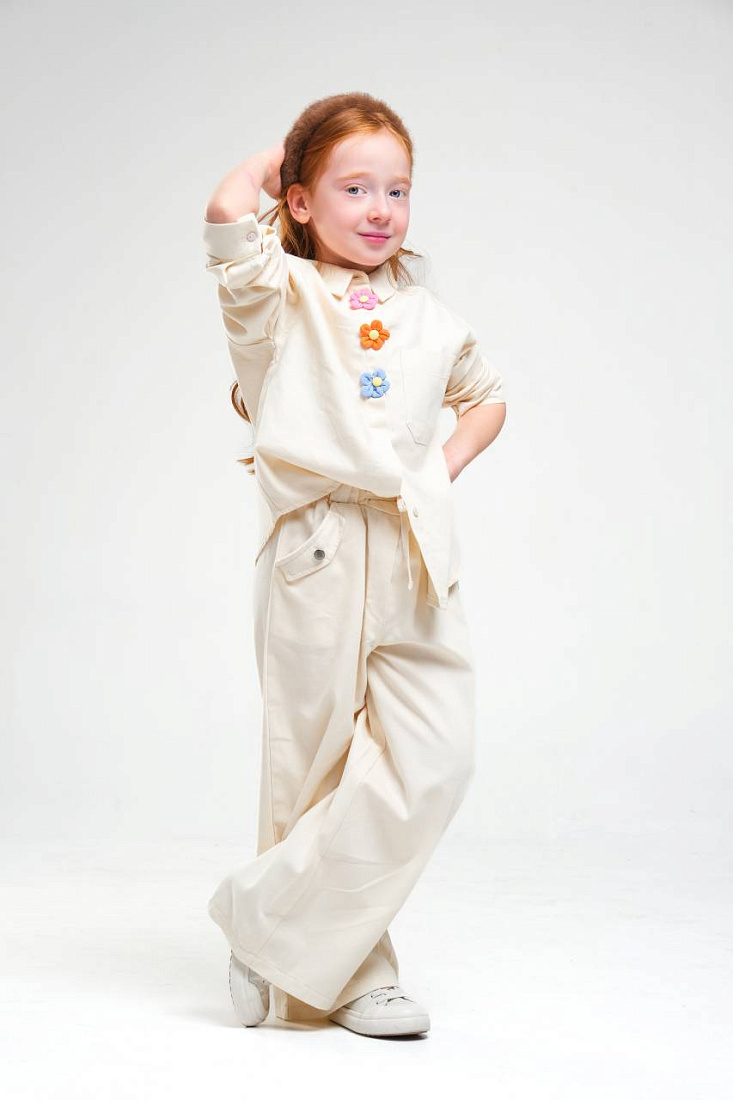 Брюки для девочки выполнены в универсальном светлом оттенке, который легко сочетается с различными элементами гардероба. Материал визуально напоминает мягкую и гладкую ткань, приятную на ощупь и подходящую для повседневной носки. Свободный крой обеспечивает комфорт и свободу движений, что особенно важно для активных детей. Дизайн лаконичный, без лишних деталей, что делает брюки подходящими для разных случаев — как для школы, так и для прогулок. Эластичный пояс не сковывает движения и позволяет легко надевать изделие самостоятельно. Отсутствие лишних декоративных элементов и ярких акцентов придает брюкам стильный и современный вид. Ткань выглядит дышащей, что обеспечивает оптимальный микроклимат в течение дня. Брюки для девочки имеют прямой силуэт, визуально удлиняющий ноги и придающий образу аккуратность. Классическая длина до пола делает их универсальным выбором на каждый день.