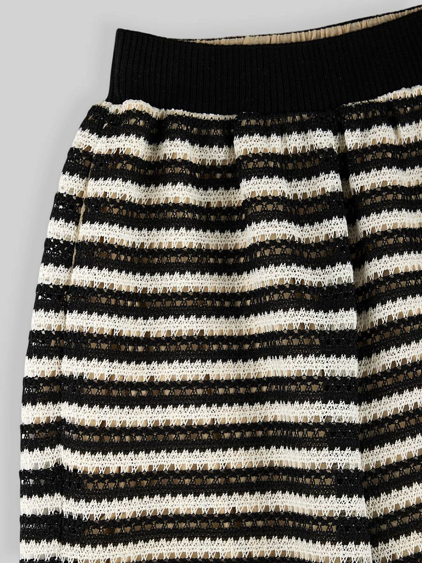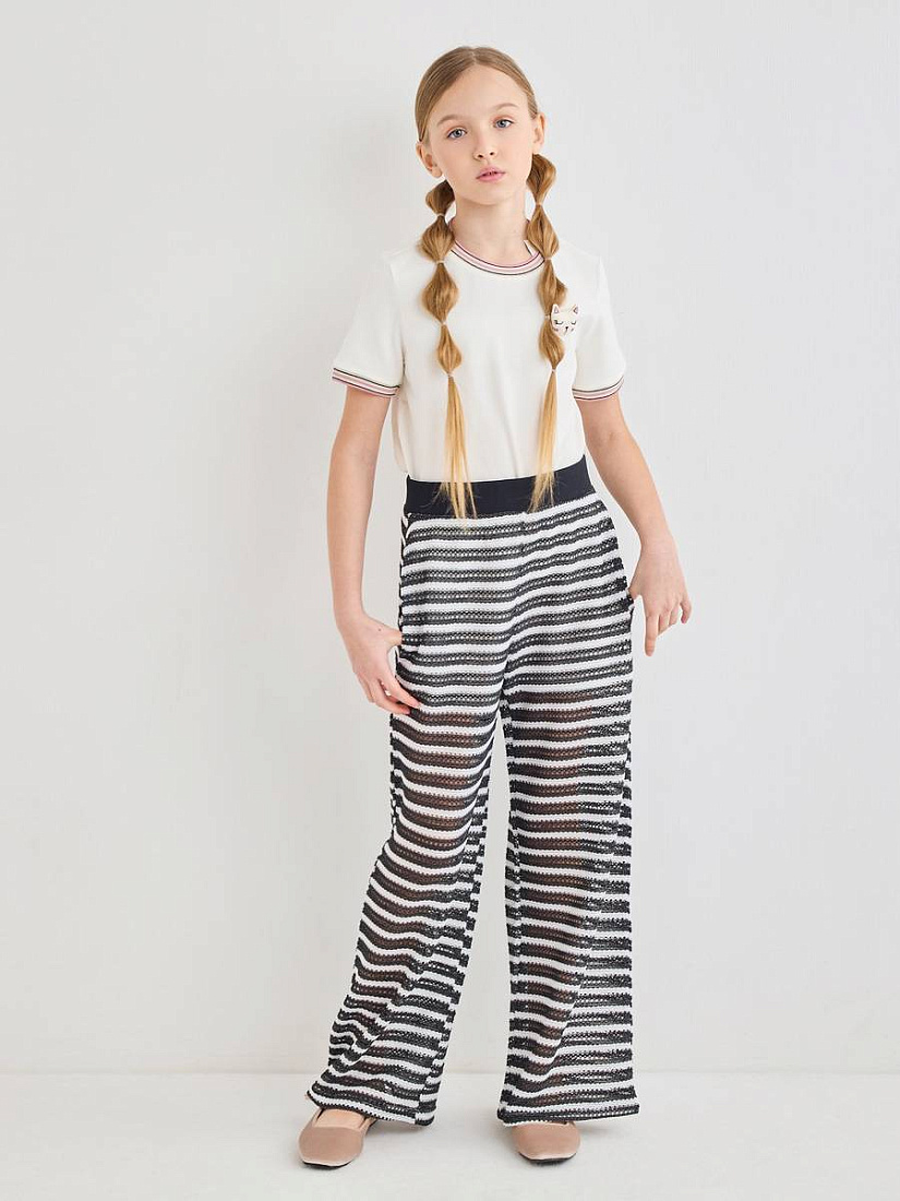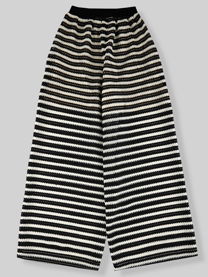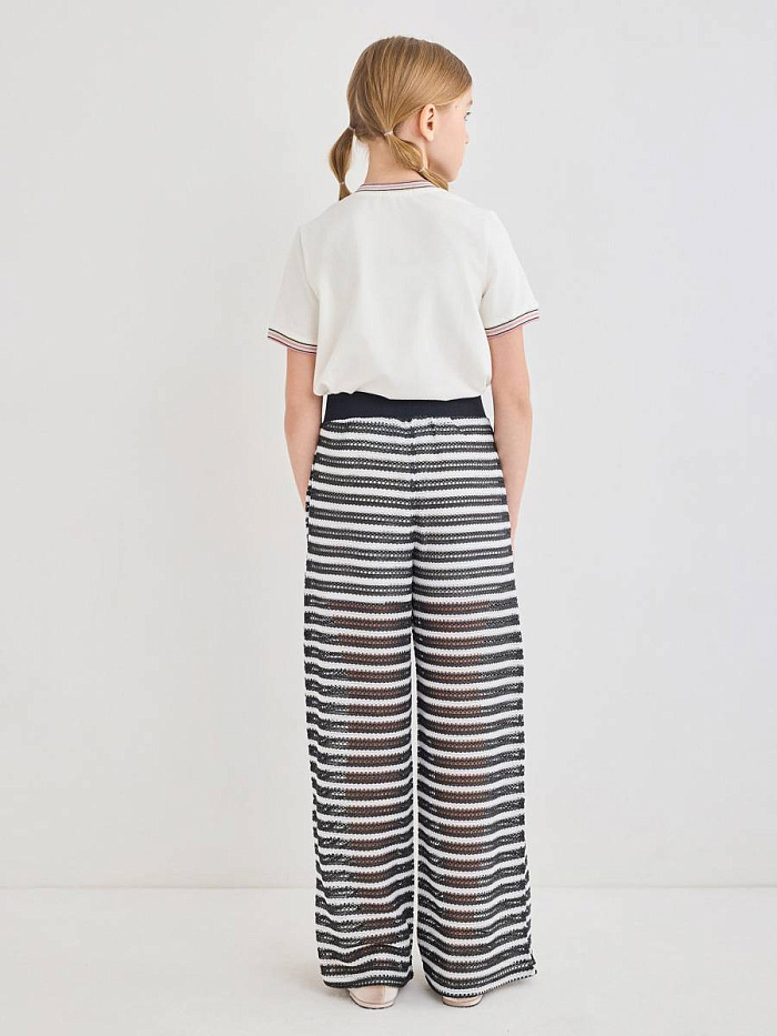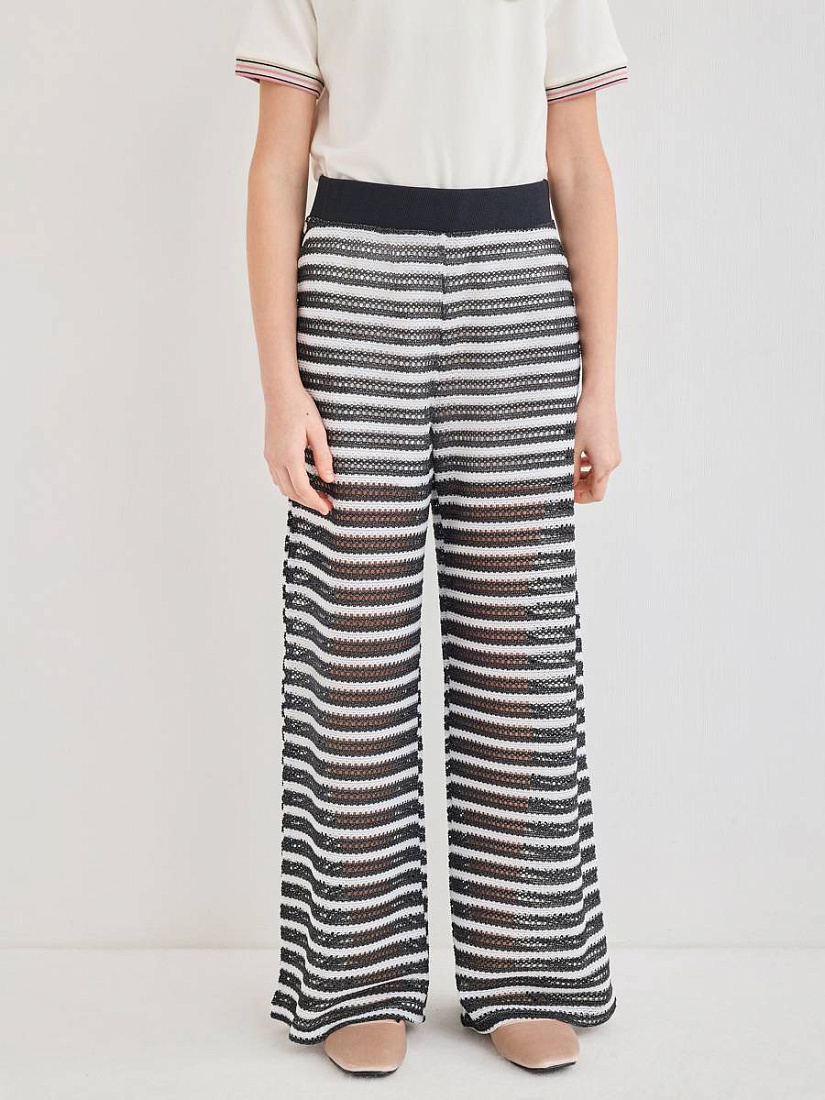 Брюки для девочки выполнены из легкого ажурного материала с выразительным чередованием темных и светлых горизонтальных полос. Дизайн отличается свободным кроем, что обеспечивает комфорт и свободу движений в повседневной носке. Материал брюк полупрозрачный, что придает изделию оригинальность и современный вид, а также делает его отличным выбором для теплого времени года. Широкий эластичный пояс обеспечивает надежную посадку и удобство при длительном ношении. Брюки подходят для девочки, которая ценит стиль и комфорт, а также желает выделяться в любой обстановке. Вязаная текстура добавляет интересный акцент, делая изделие заметным и трендовым. Благодаря универсальному сочетанию цветов брюки легко впишутся в гардероб, сочетаясь с футболками, топами и легкими жакетами. Приятный на ощупь материал не раздражает кожу и отлично пропускает воздух. Модель подойдет для прогулок, отдыха, а также для создания модных образов на каждый день.