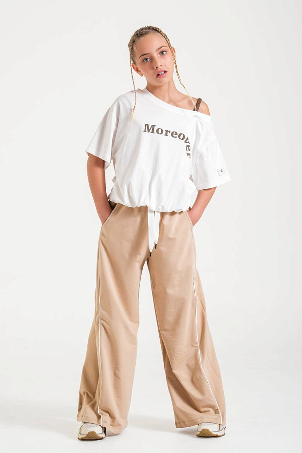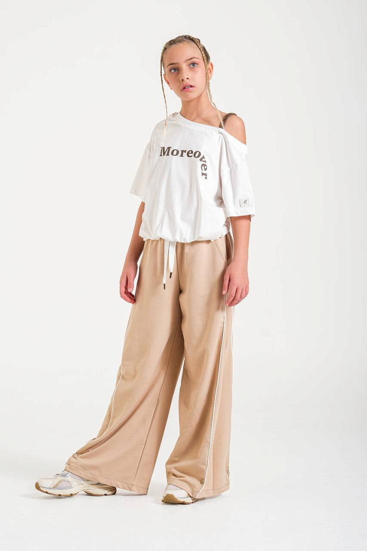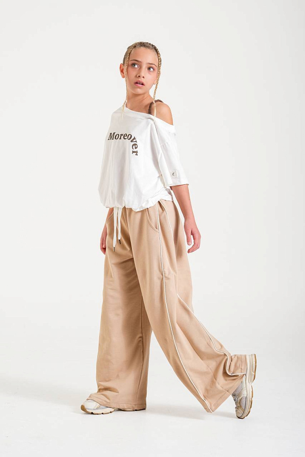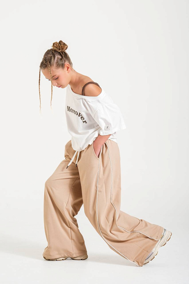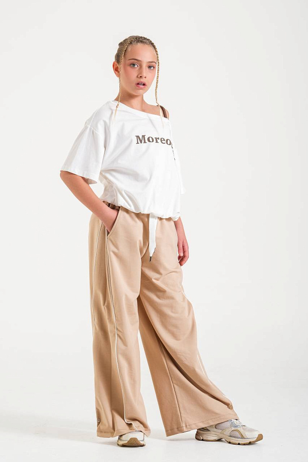 Брюки для девочки выполнены в современном стиле и идеально подходят для создания стильного и удобного образа на каждый день. Модель представлена в универсальном бежевом цвете, который легко сочетается с различной одеждой и обувью. Благодаря свободному крою брюки обеспечивают максимальный комфорт при движении, не сковывают и отлично подойдут для активного образа жизни. Материал визуально напоминает мягкую и гладкую ткань, приятную на ощупь, что позволяет носить брюки длительное время без ощущения дискомфорта. Дизайн дополнен эластичным поясом с регулируемым шнурком, что позволяет индивидуально подогнать изделие по фигуре. Прямые широкие штанины придают брюкам модный и расслабленный силуэт, а боковые карманы делают изделие еще более практичным. Лаконичные контрастные линии по бокам визуально вытягивают силуэт и добавляют интересный акцент. Брюки подходят для повседневных прогулок, занятий спортом, отдыха или встреч с друзьями.
