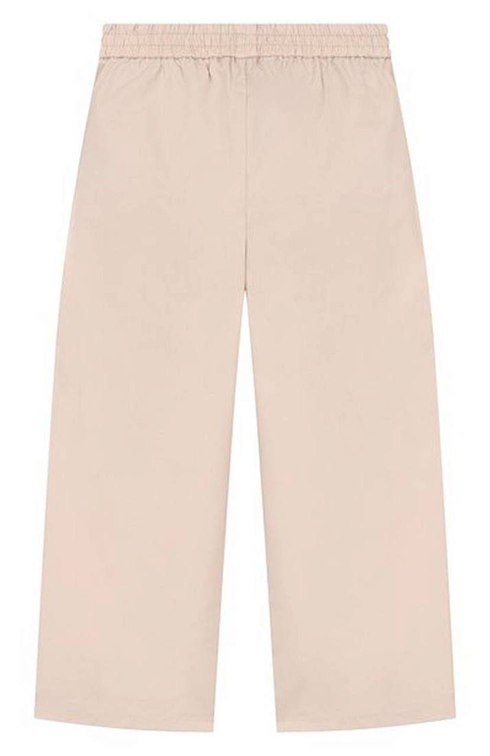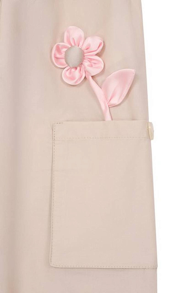 Широкие брюки с эластичным поясом выполнили из чистого хлопка. Модель с накладными карго украсили объемной атласной аппликацией в виде цветка.