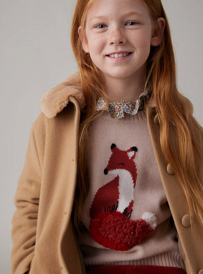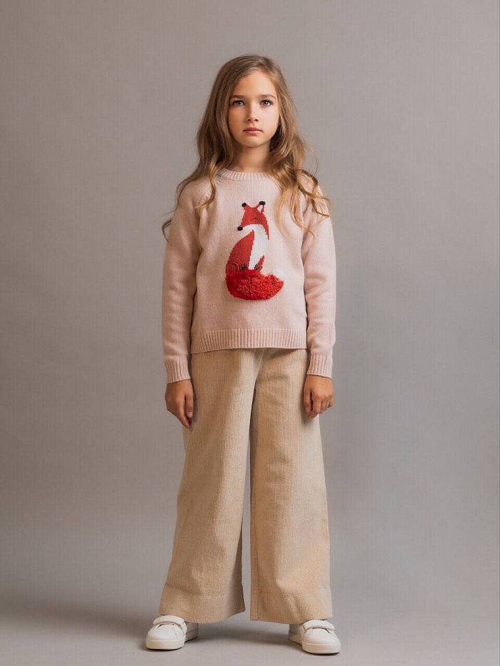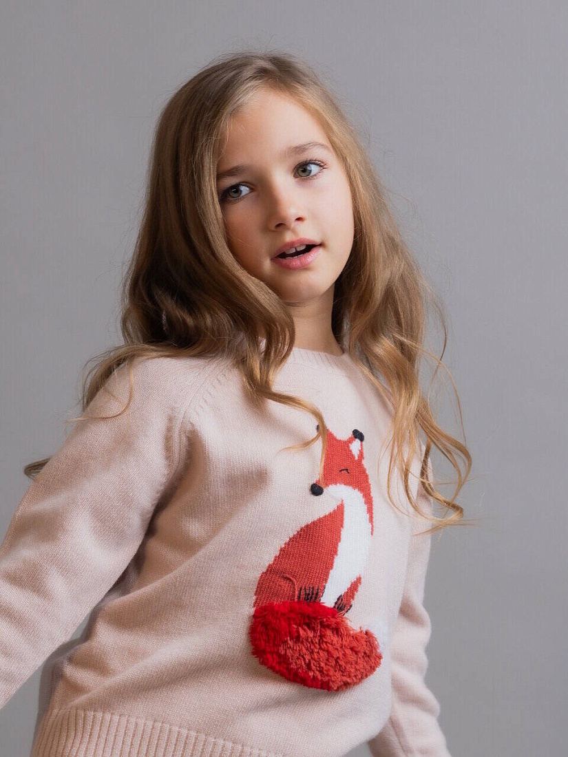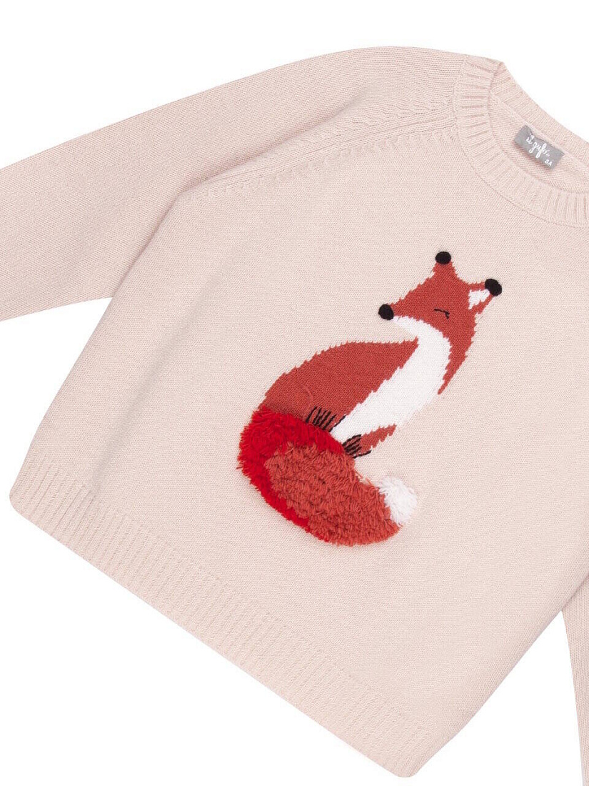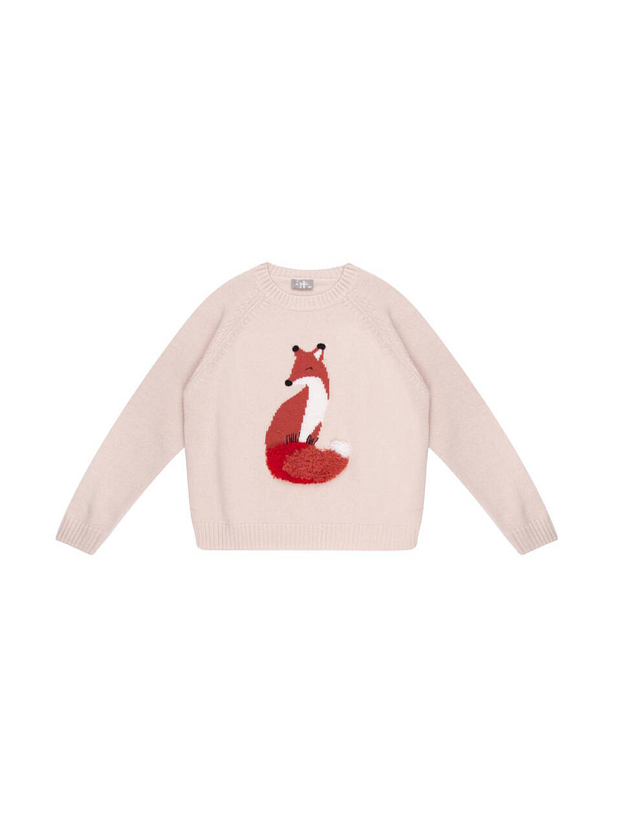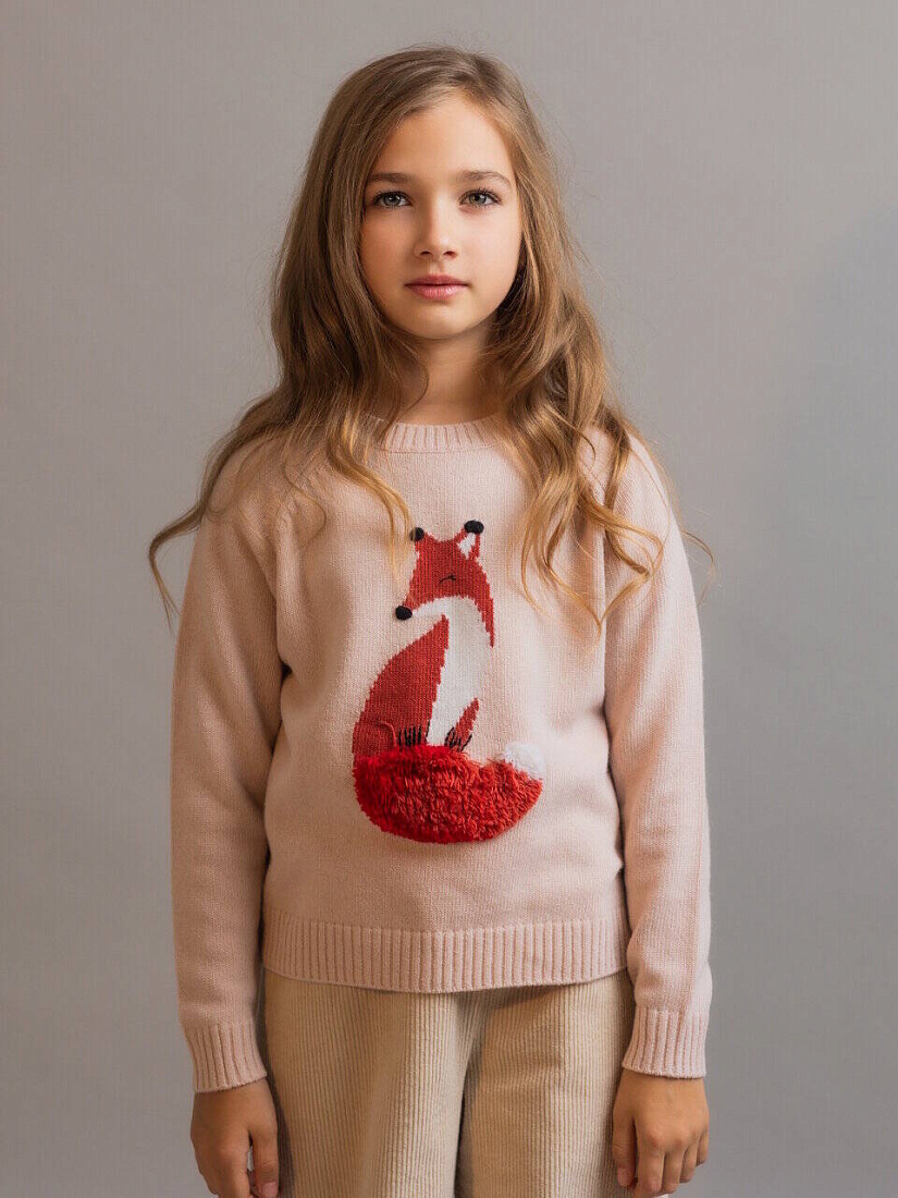 Джемпер для девочки Il Gufo с круглым вырезом, изготовленный из чистой сверхтонкой шерсти мериноса, качество которой подтверждено сертификатом Woolmark®, отличается изображением очаровательной лисы, оформленным в виде интарсии в белых и кирпично-красных тонах, с вышитыми вручную деталями и хвостом, выполненным рельефным швом под мех. Рукав реглан. Ворот, манжеты и низ - в рубчик.