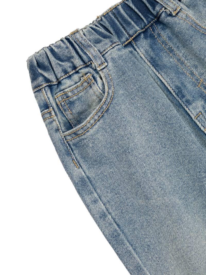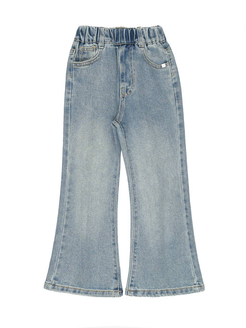 Брюки джинсовые для девочки выполнены из прочного и приятного на ощупь денима. Светло-голубой цвет материала с плавным переходом оттенков создает модный и универсальный образ, подходящий для ежедневной носки. Эластичный пояс обеспечивает комфортную посадку, позволяя легко надевать и снимать изделие без лишних усилий. Классический фасон с пятью карманами делает брюки практичными, а также позволяет удобно хранить мелкие вещи. Джинсовые брюки имеют слегка расклешенные штанины, что придает образу стильную динамику и современность. На задней части присутствует декоративная нашивка, которая подчеркивает оригинальность дизайна. Материал отличается прочностью и износостойкостью, благодаря чему брюки сохраняют привлекательный внешний вид даже при частых стирках. Швы аккуратно обработаны, нет лишних деталей, что делает модель лаконичной и удобной для активных игр и прогулок. Ткань приятная на ощупь, не вызывает дискомфорта и подходит для чувствительной кожи ребенка.