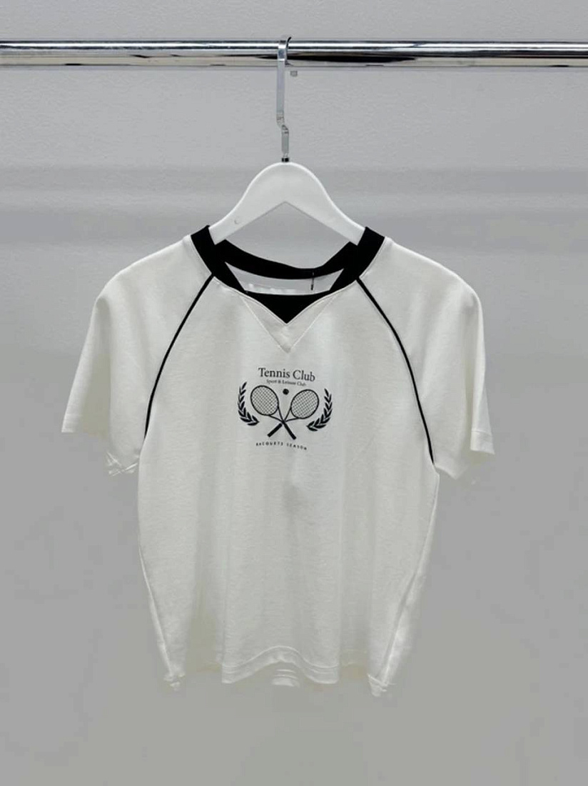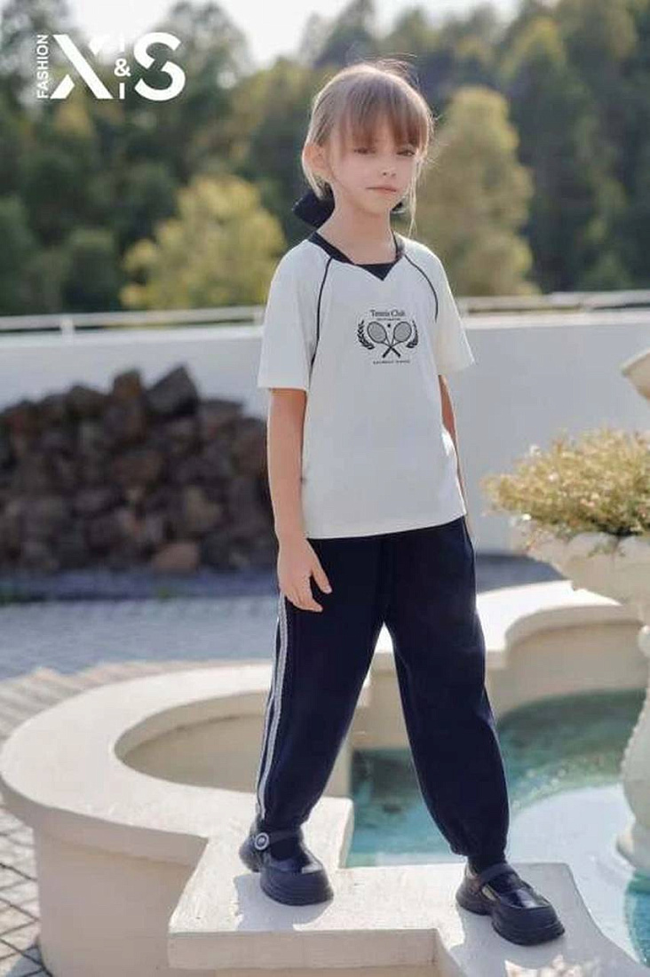 Футболка для девочки выполнена в современном спортивном стиле и идеально подходит для повседневной носки. Модель выполнена из мягкого и приятного на ощупь материала, который обеспечивает комфорт в течение всего дня. Основной цвет — белый, что придает изделию свежий и универсальный вид, легко сочетающийся с разными элементами гардероба. Вставки и окантовка горловины, а также контрастные швы выполнены в черном цвете, что делает дизайн более выразительным и стильным.На передней части изделия расположен принт с изображением теннисных ракеток, веточек и надписью, создающей спортивное настроение и подчеркивающей активный образ жизни. Футболка имеет короткие рукава и свободный крой, что обеспечивает свободу движений и делает ее удобной для игр и прогулок на свежем воздухе. V-образный вырез с дополнительной черной вставкой выделяет изделие среди других моделей и придает индивидуальность.