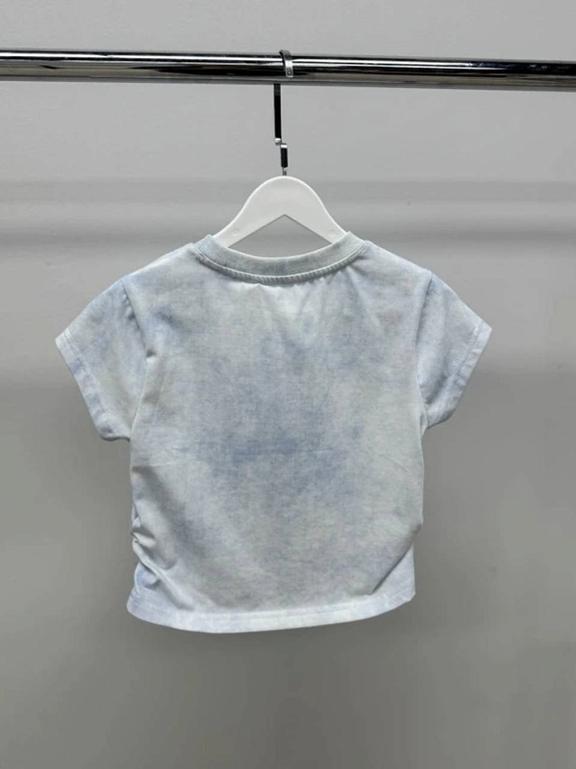 Футболка для девочки выполнена в светлом голубоватом оттенке с легким эффектом тай-дай, что придает ей свежий и современный вид. На передней части изделия размещен нежный принт в виде сердца, обрамленного тонкими лентами и бантиками, а внутри надпись “MAKE ME Style” добавляет индивидуальности и модного акцента. Короткие рукава и круглый ворот делают модель универсальной для повседневного гардероба, обеспечивая комфорт при носке. Материал футболки визуально выглядит мягким, легким и приятным к телу, что особенно важно для детской одежды. На обратной стороне отсутствуют дополнительные элементы, дизайн остается лаконичным и аккуратным. Качественная обработка швов и аккуратная посадка подчеркивают долговечность изделия. Эта футболка для девочки идеально подойдет для прогулок, занятий или отдыха, сочетаясь с разными стилями одежды. Благодаря универсальному цвету и нежному декору изделие легко комбинируется с юбками, шортами и джинсами.