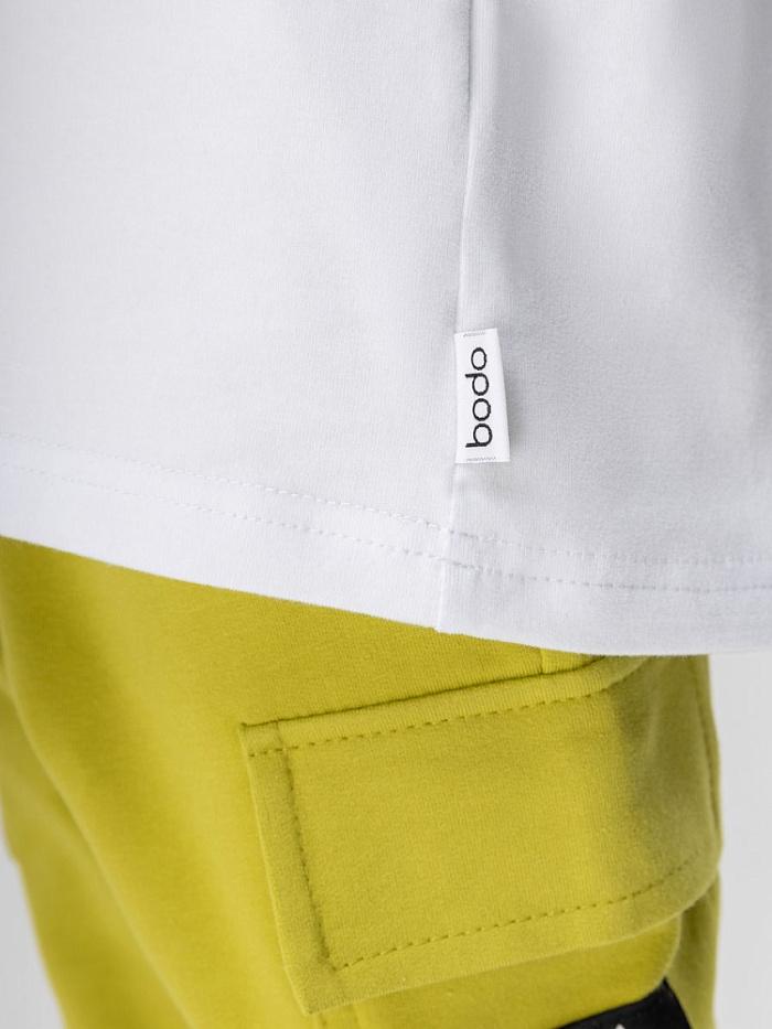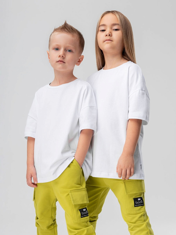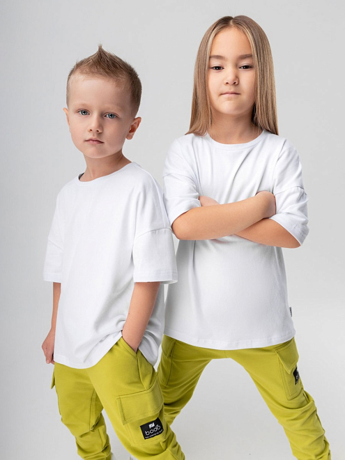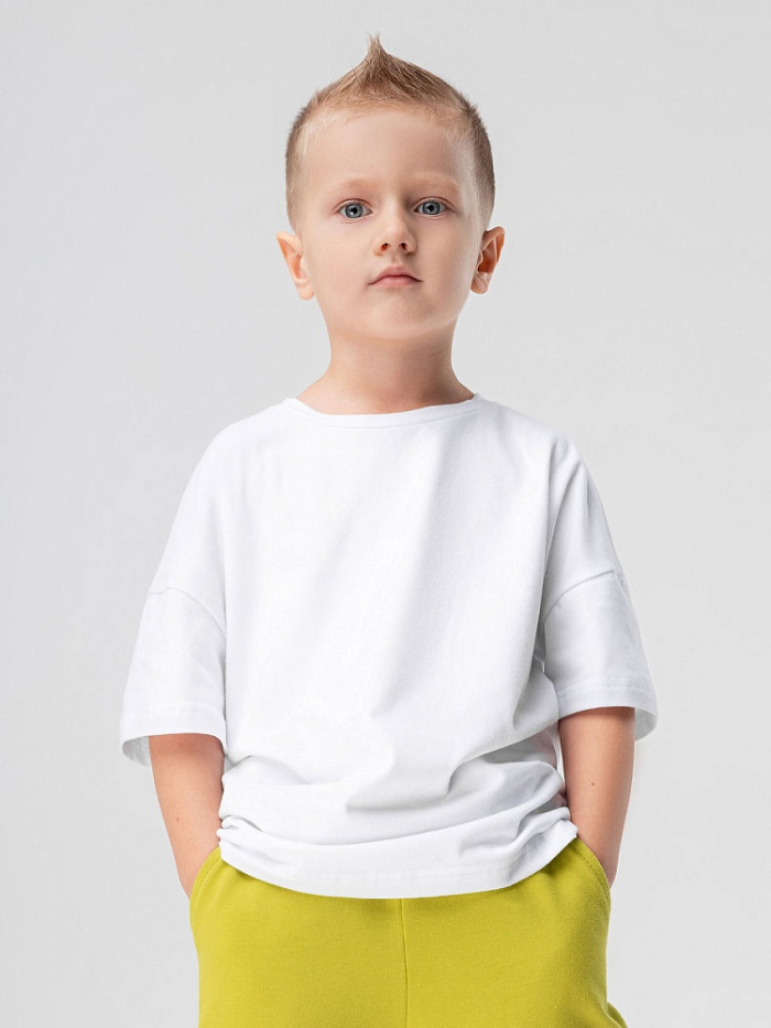 Футболка детская. Детали: короткий спущенный рукав, свободный покрой, округлый вырез горловины. Состав: кулирная гладь с ПИЧ (Peach) эффектом 92% хлопок 8% лайкра