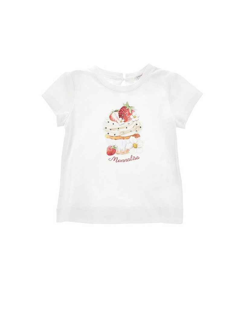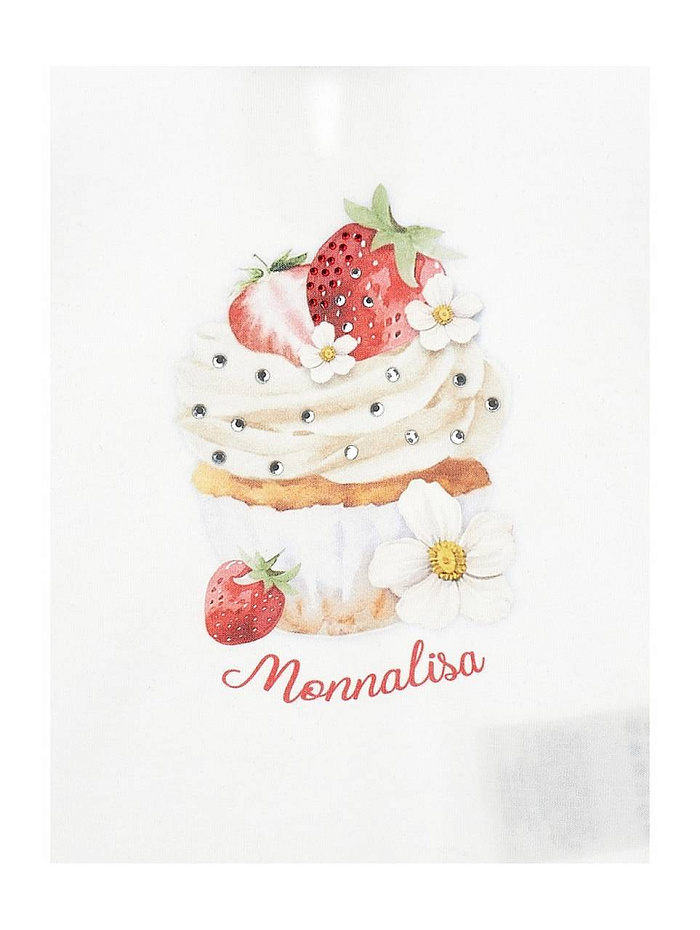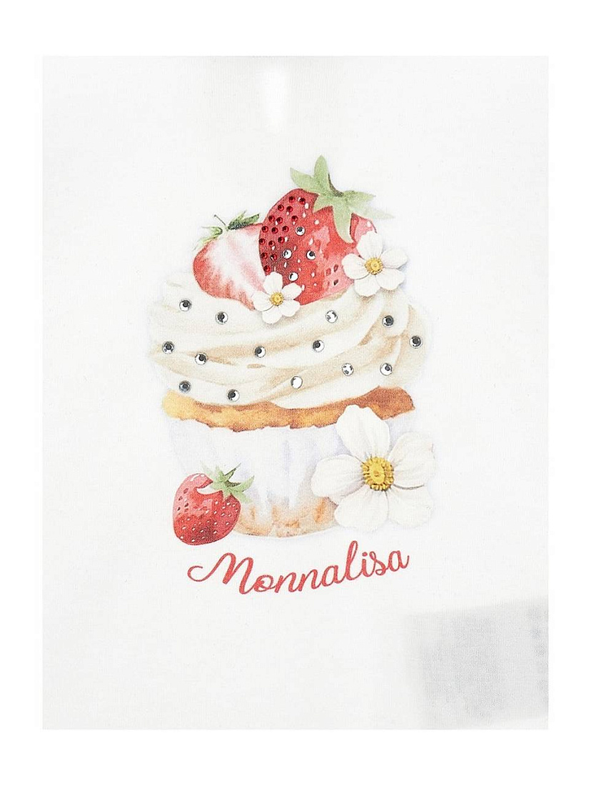 Футболка для девочки выполнена из мягкого и приятного на ощупь материала, который обеспечивает комфорт в течение всего дня. Белый цвет придает изделию универсальность и свежий внешний вид, позволяя легко сочетать его с различными предметами гардероба. На лицевой стороне футболки расположен яркий и детализированный принт с изображением аппетитного капкейка, украшенного клубникой, кремом и цветочными элементами, что создает игривое и жизнерадостное настроение. Декорирование блестящими стразами придает изделию легкий праздничный акцент и делает его особенно привлекательным для маленьких модниц. Круглый вырез горловины и короткие рукава обеспечивают удобство и свободу движений, что особенно важно для активных детей. Материал футболки выглядит дышащим и легким, подходящим для повседневной носки в теплое время года. Принт выполнен в нежных пастельных оттенках, что подчеркивает детский стиль и добавляет изюминку в образ.