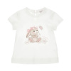 Футболка для девочки выполнена из легкого и мягкого материала, обеспечивающего комфорт при носке в течение всего дня. Белый цвет изделия визуально освежает образ и легко сочетается с различными элементами гардероба. На передней части размещен крупный принт с милым зайчиком, украшенным розовым бантиком, который сидит среди нежных цветов. Рядом изображен маленький бабочка, создавая атмосферу уюта и радости. Дизайн выглядит аккуратно и привлекательно, а рисунок выполнен в пастельных тонах, что делает изделие универсальным для разных случаев. Короткие рукава обеспечивают свободу движений, круглый вырез горловины подчеркивает классический стиль, а аккуратная строчка по краям добавляет изделию прочности и долговечности. Футболка хорошо держит форму даже после многочисленных стирок, благодаря качественному материалу. Ткань приятна на ощупь, не вызывает раздражения на коже и подходит для повседневной носки.